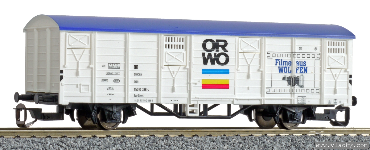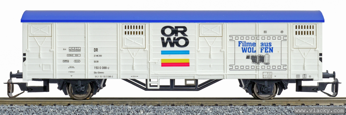 | krytý nákladní vůz bílý s modrou střechou „ORWO“ |