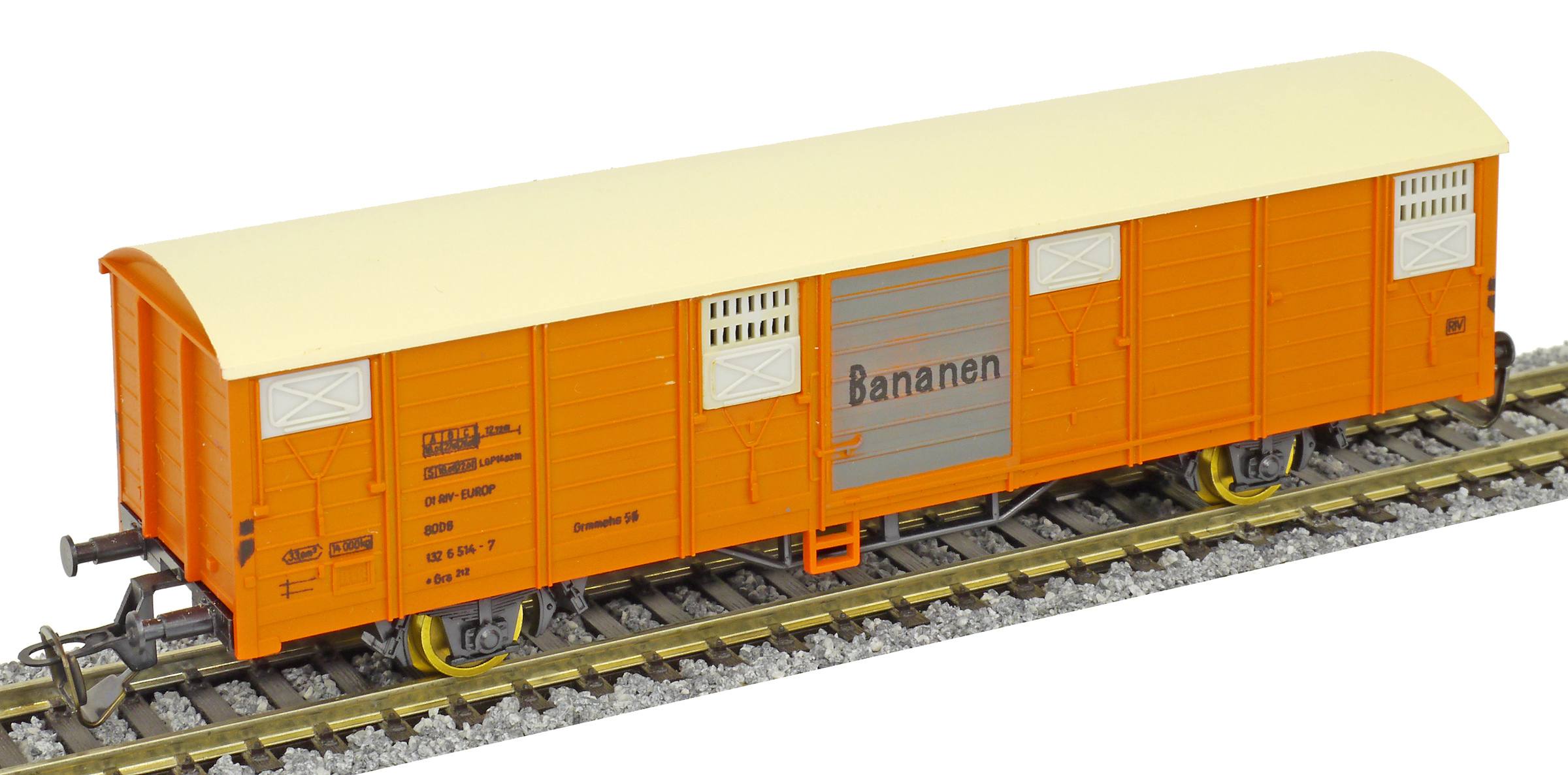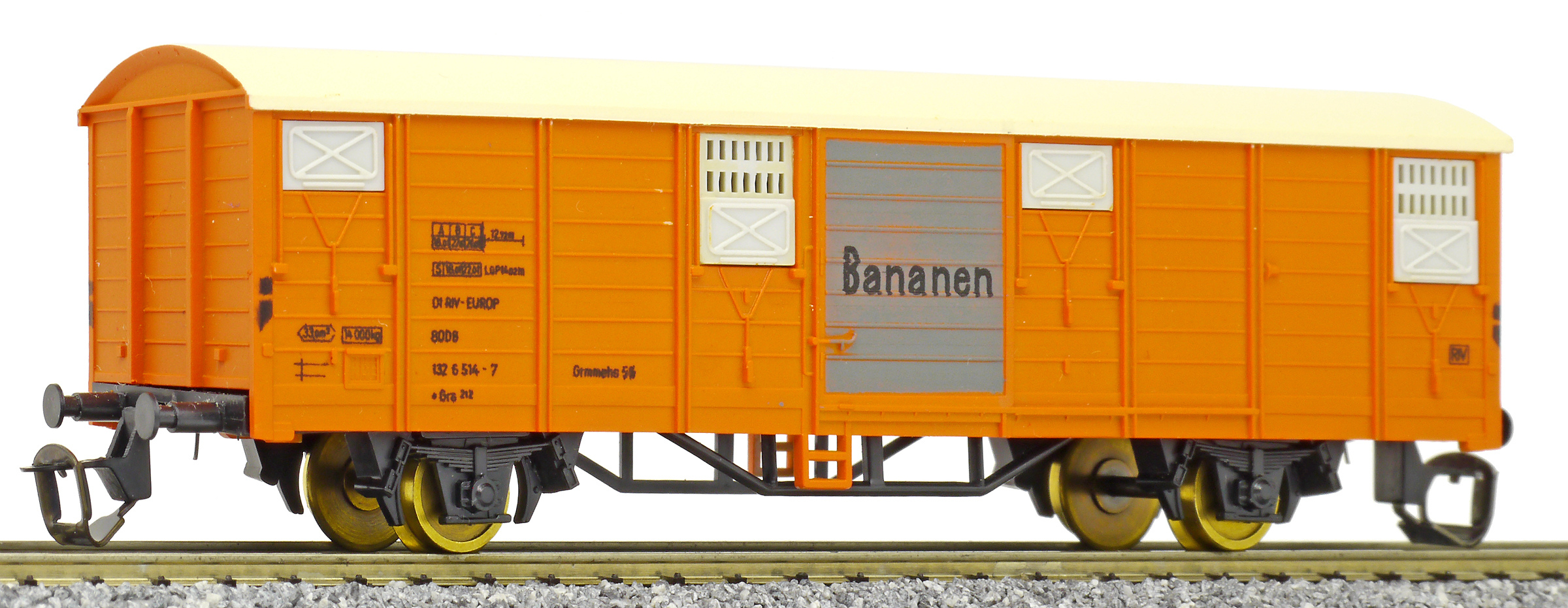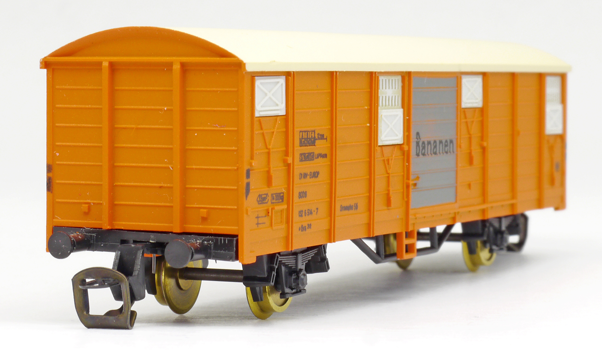 | krytý nákladní vůz oranžový s krémovou střechou a s šedými vraty „Bananen“ |