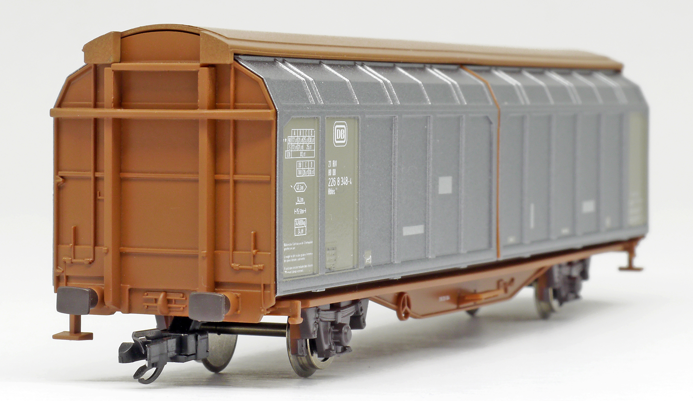 | vůz s posuvnými bočnicemi červenohnědý-stříbrný s opravnými fleky na bočnicích |