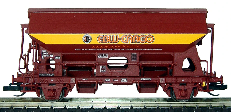 | samovýsypný nákladní vůz červenohnědý se žlutám pásem „EBW-Cargo“ |