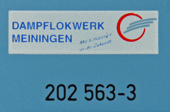 Popis   modrá s černým pojezdem "Dampflokwerk Meiningen" (DLW)