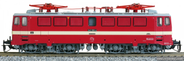 Popis   elektrická lokomotiva červená s krémovým pruhem a šedými podvozky