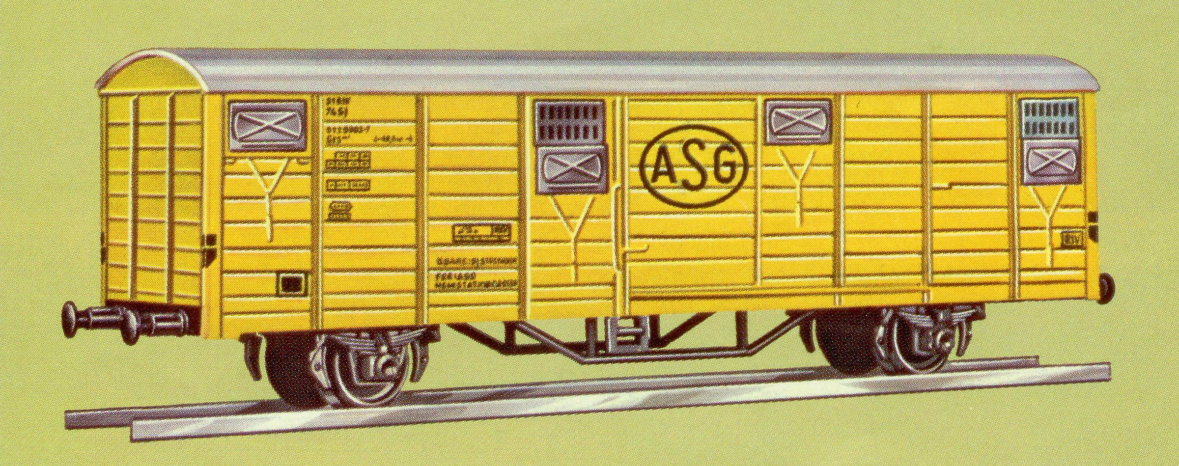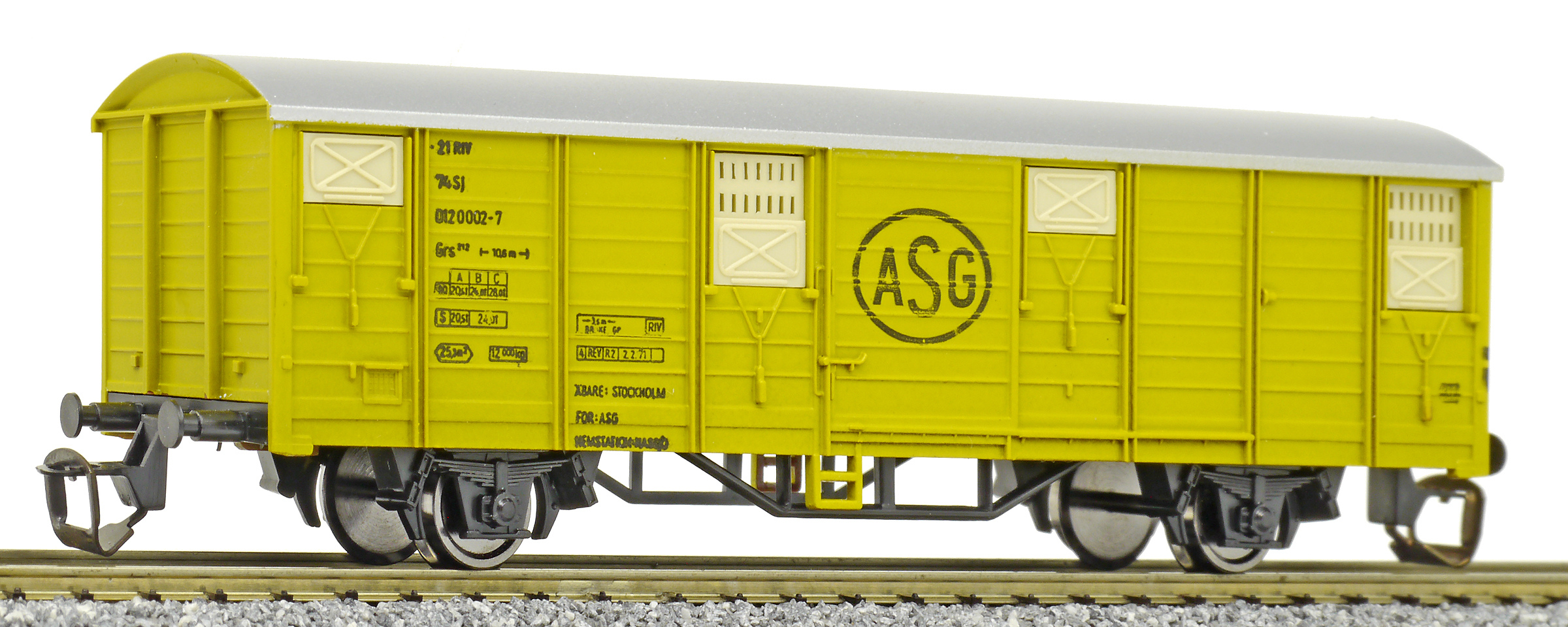 | krytý nákladní vůz žlutý s šedou střechou „ASG“ |