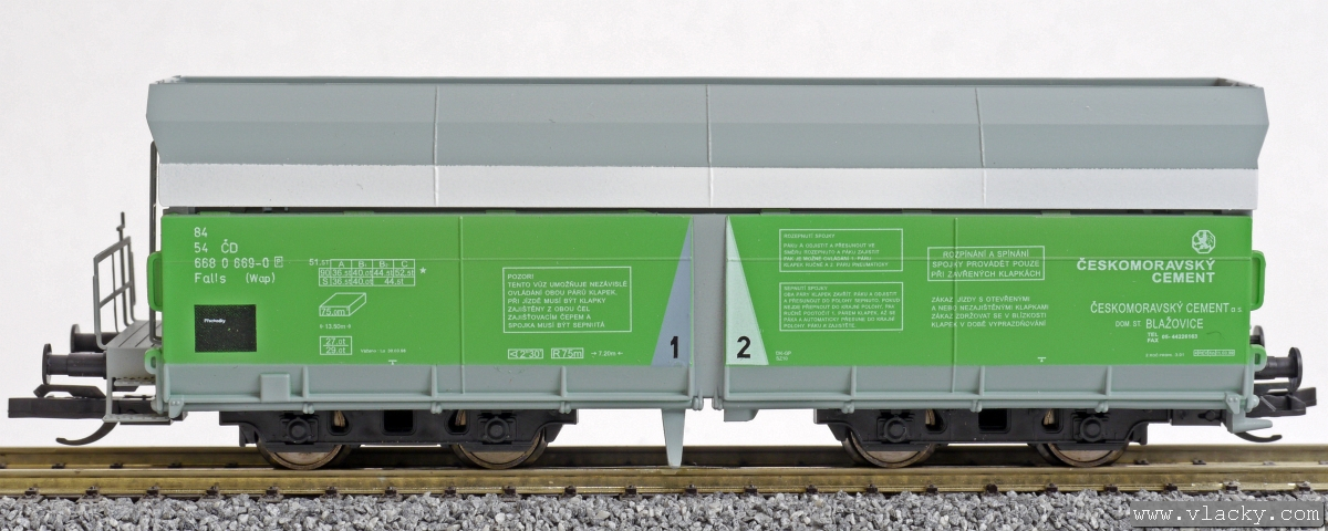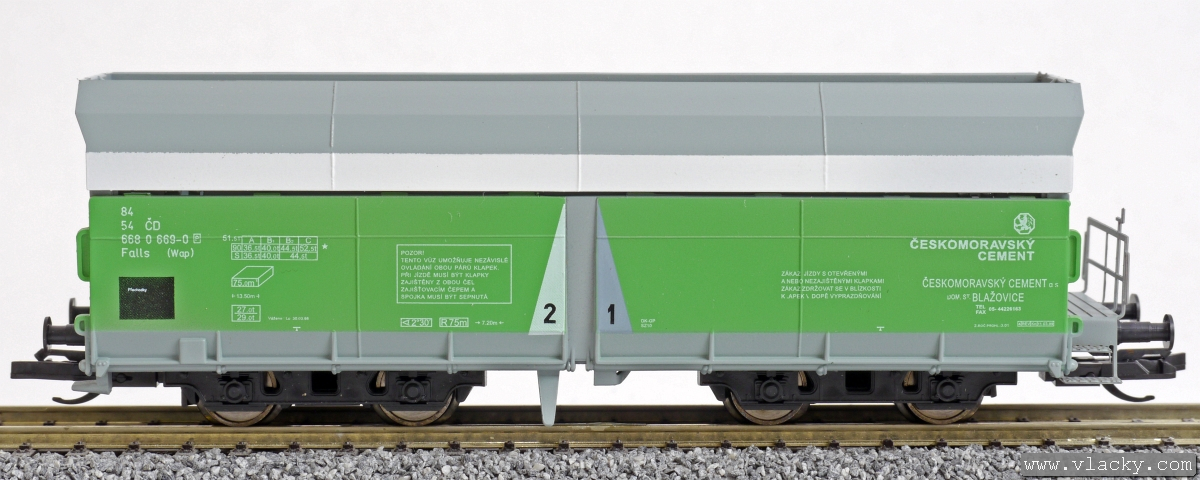 | nákladní samovýsypný vůz šedý s bílým pruhem a zelenými klapkami „Českomoravský cement“ |