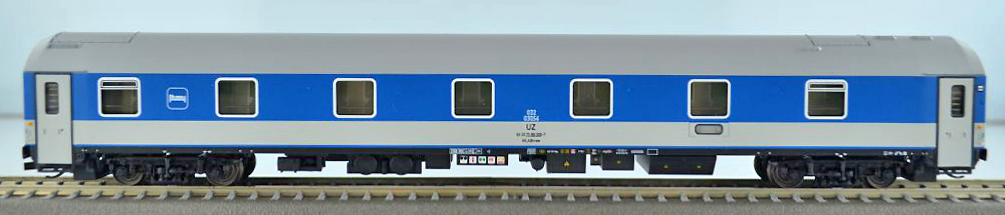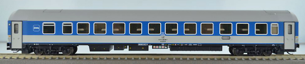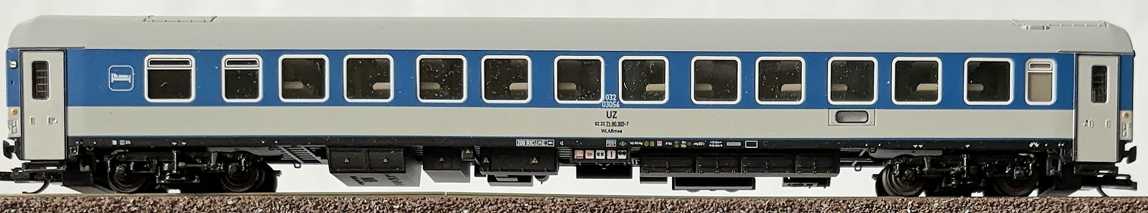 lůžkový vůz modrý-bílý se světle šedou střechou