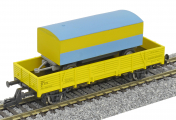 | nízkostěnný vůz žlutý s nákladem maringotky |