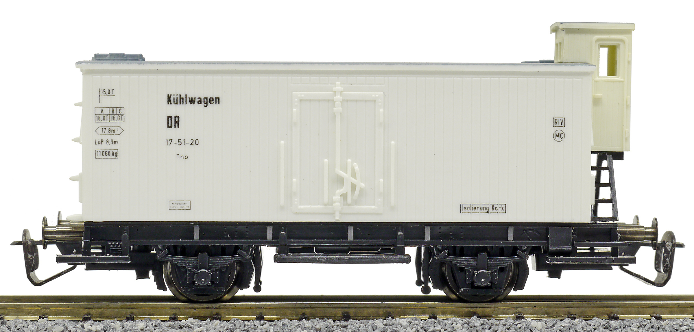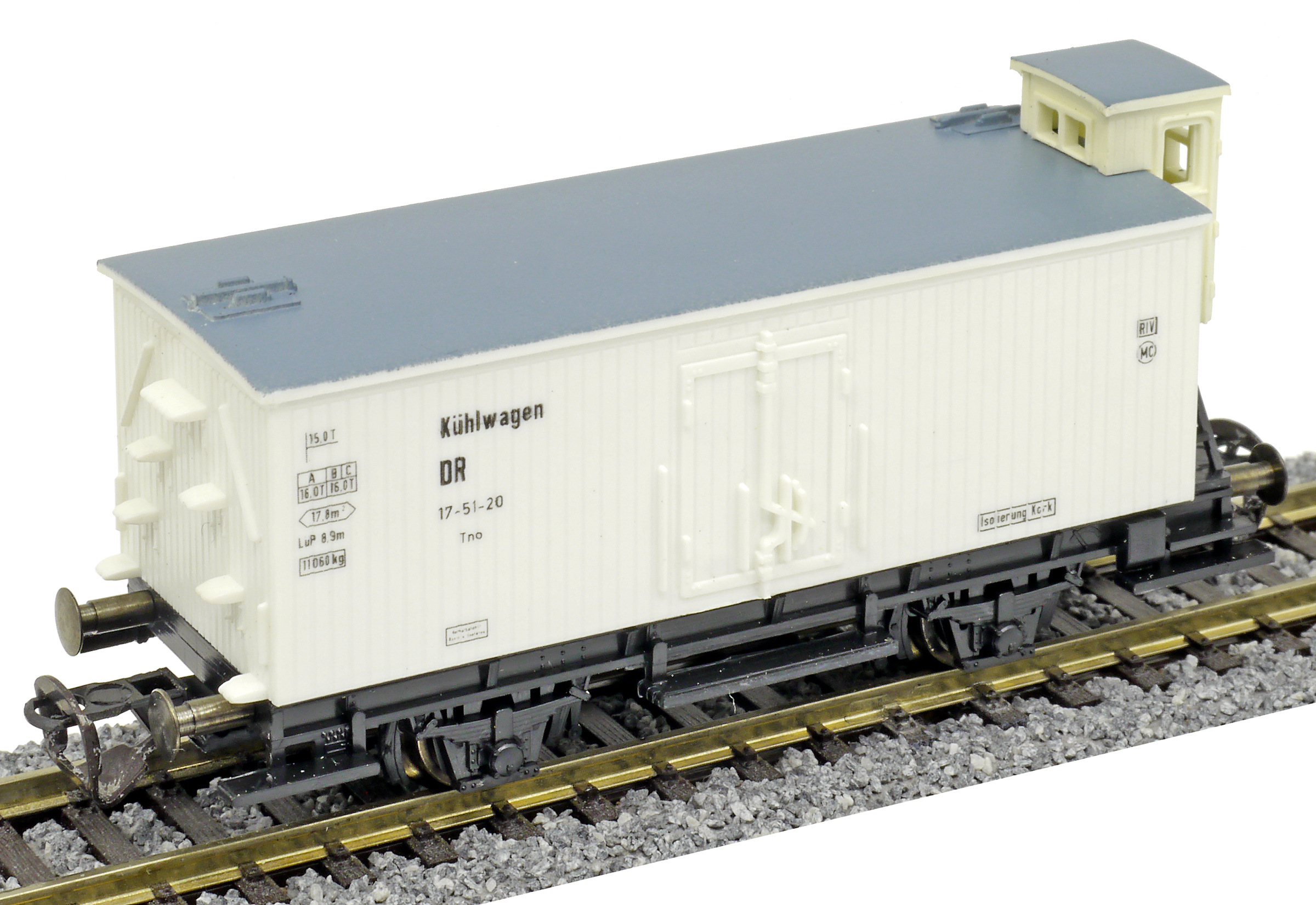 | nákladní chladící vůz bílý s šedou střechou a brzdařskou budkou |