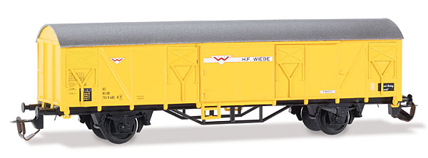 | krytý nákladní vůz žlutý se stříbrnou střechou „H.F. Wiebe“ |