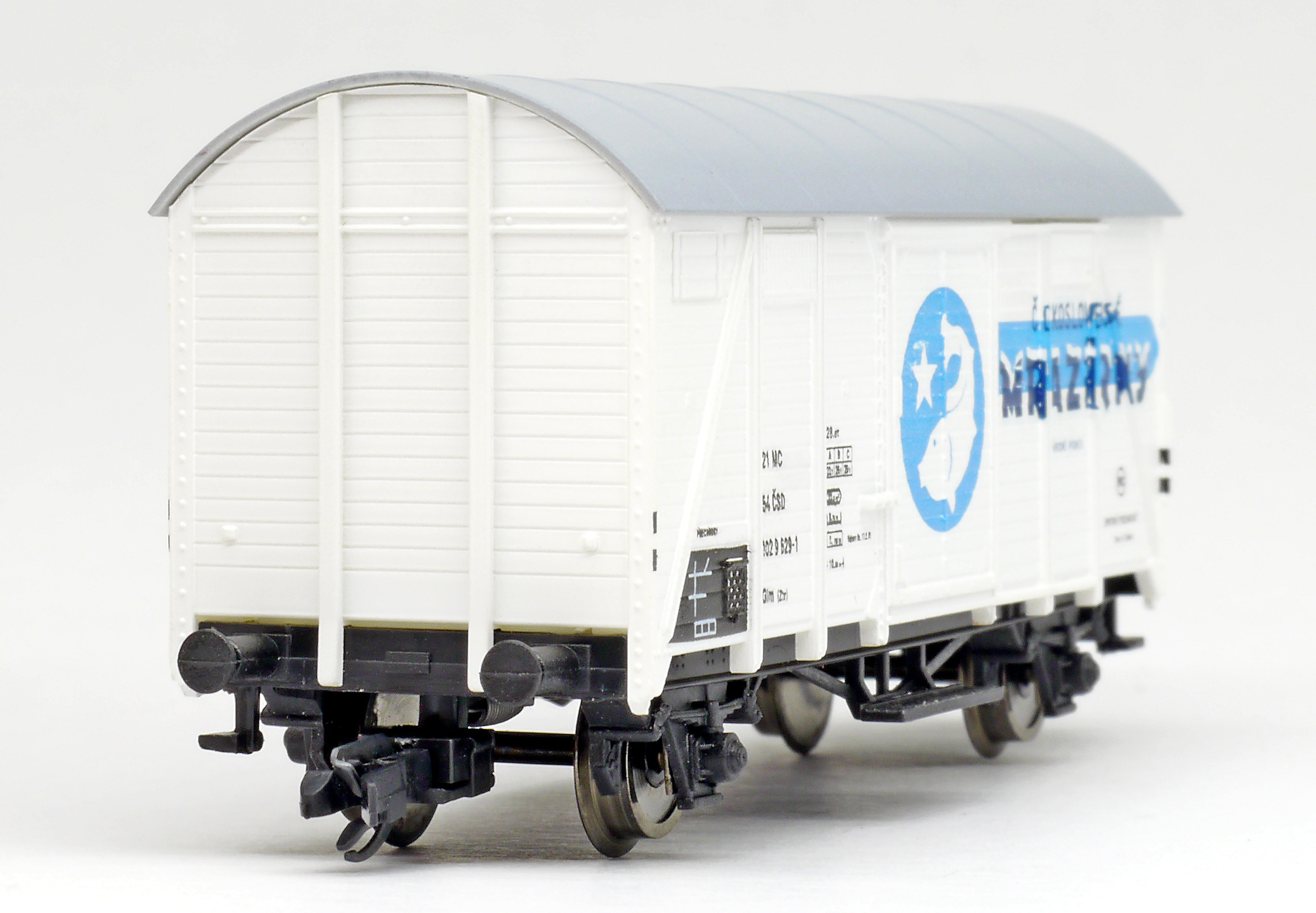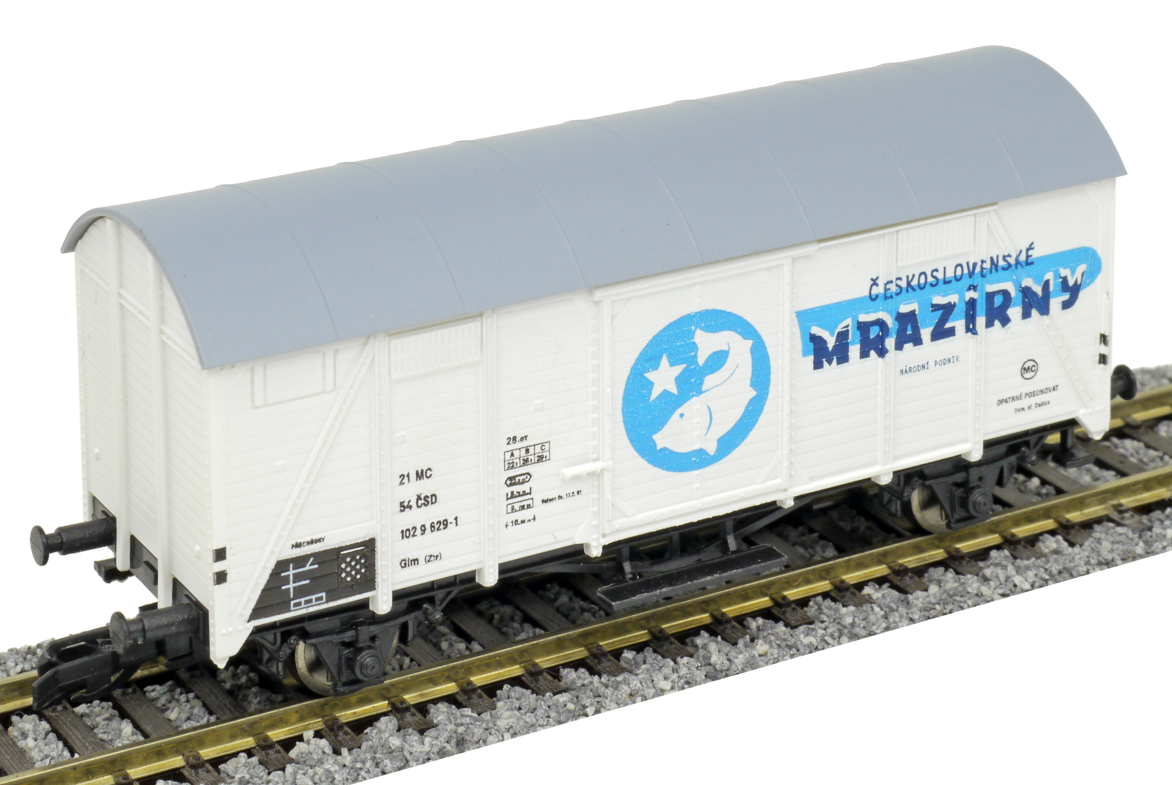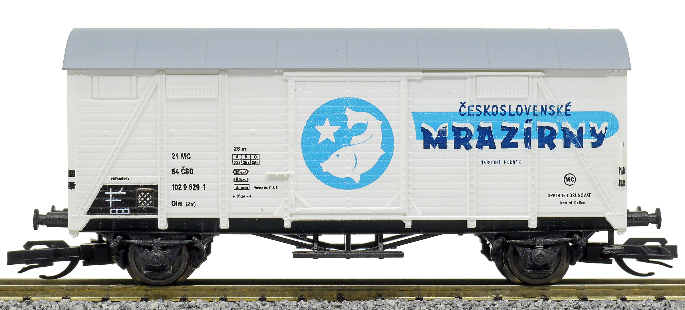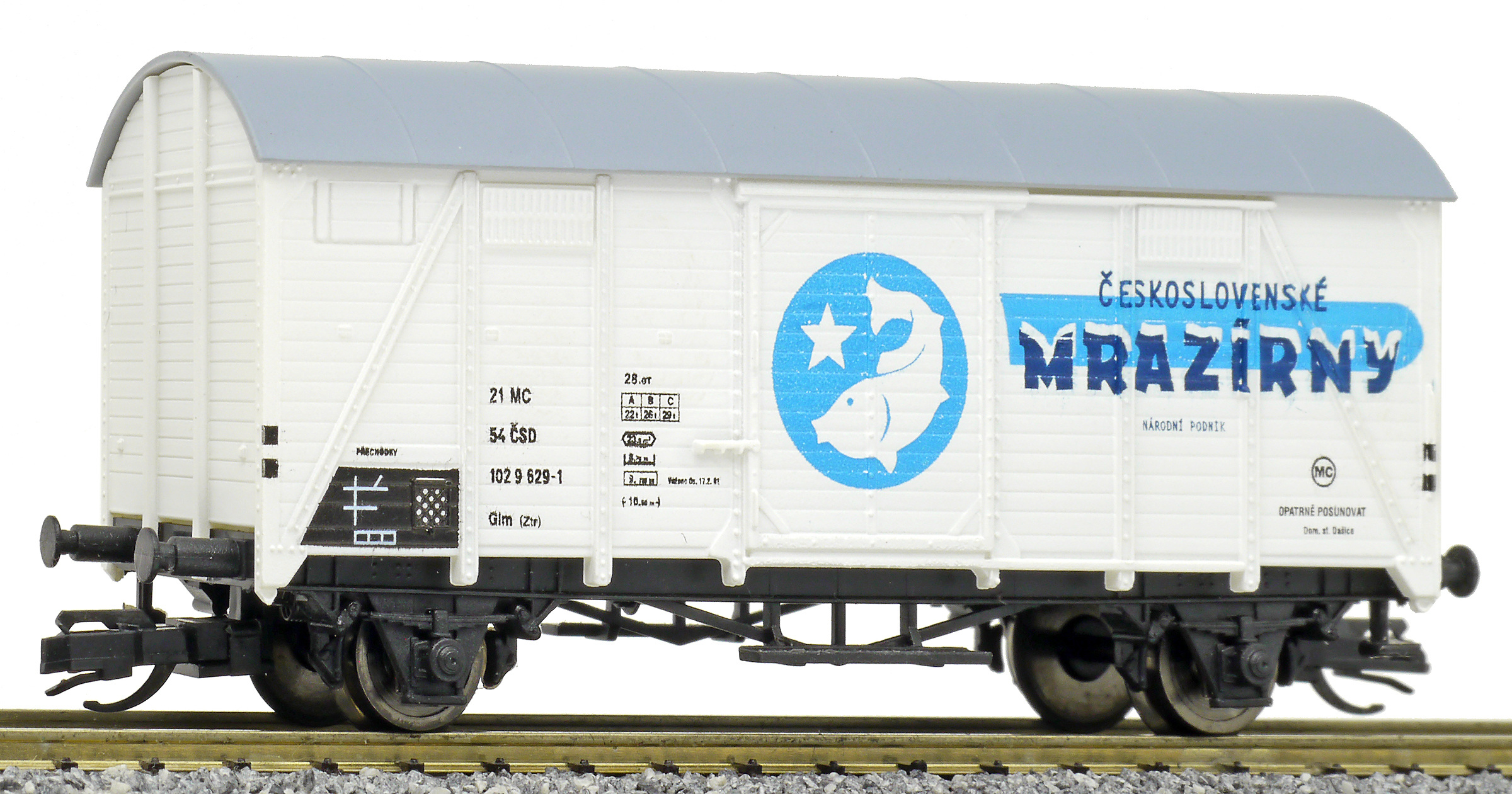 | krytý nákladní vůz bílý s šedou střechou „Československé mrazírny”, logo ryba |