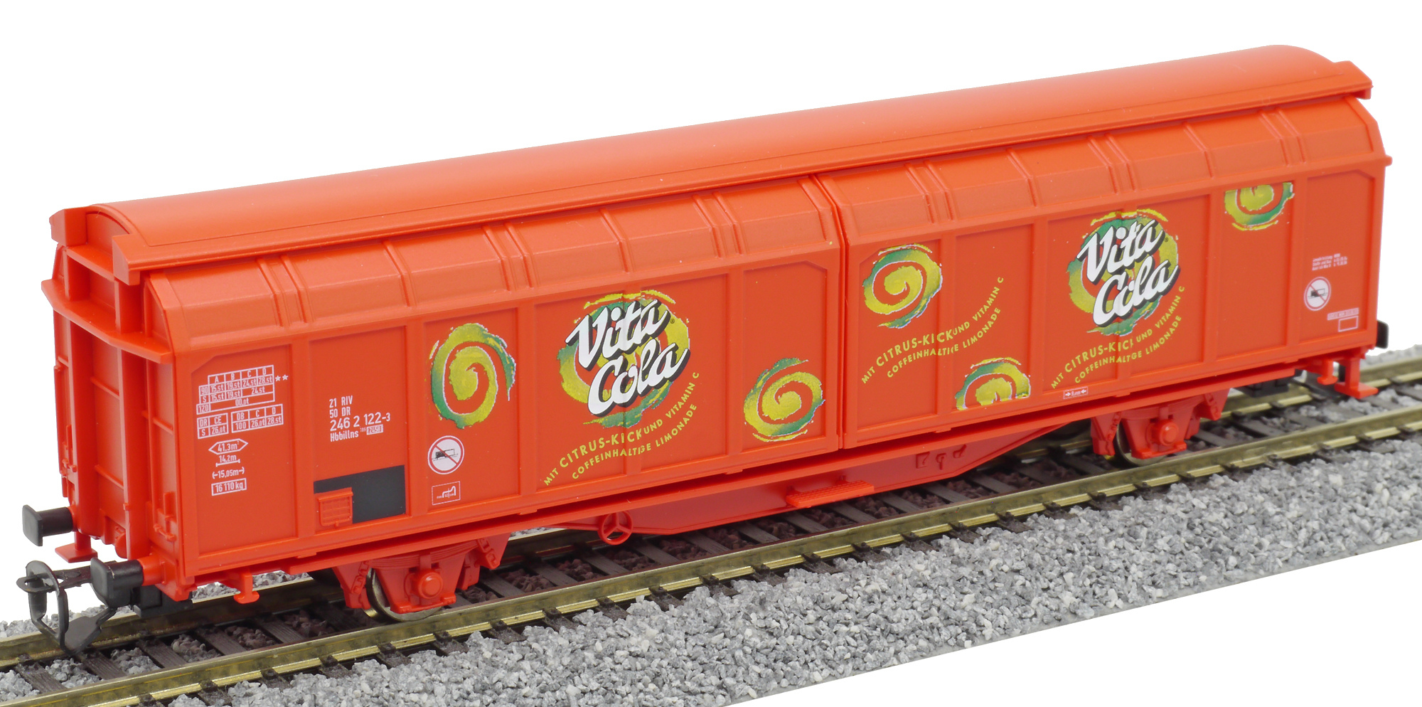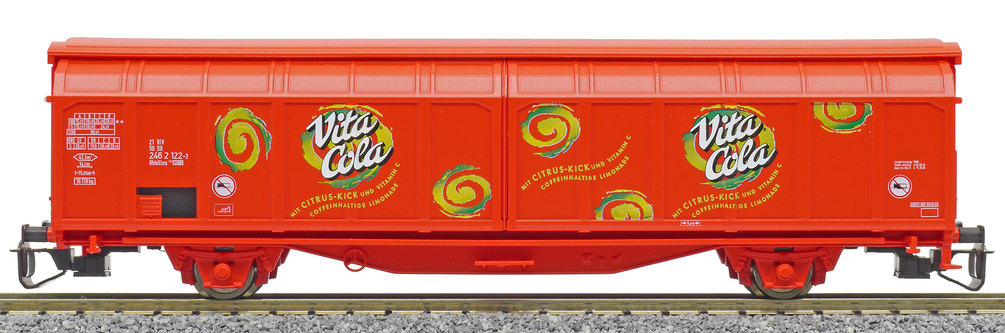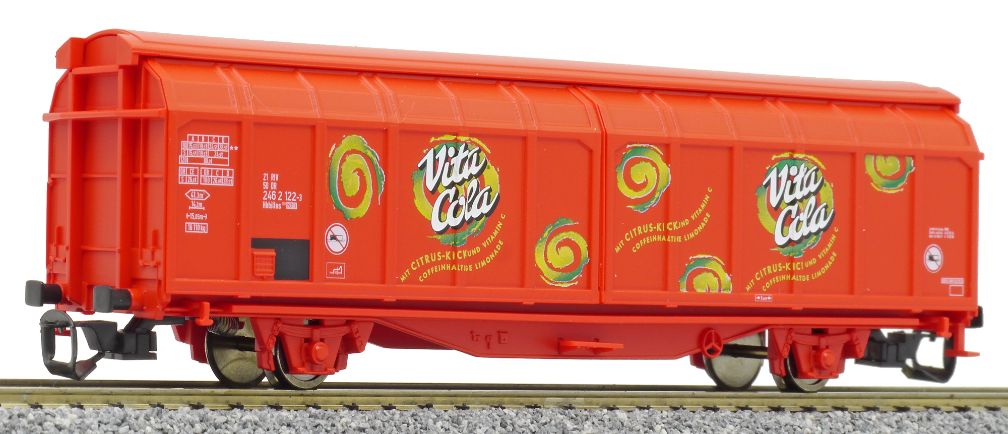 | nákladní vůz červený s posuvnými bočnicemi a s logem „Vita Cola“ |