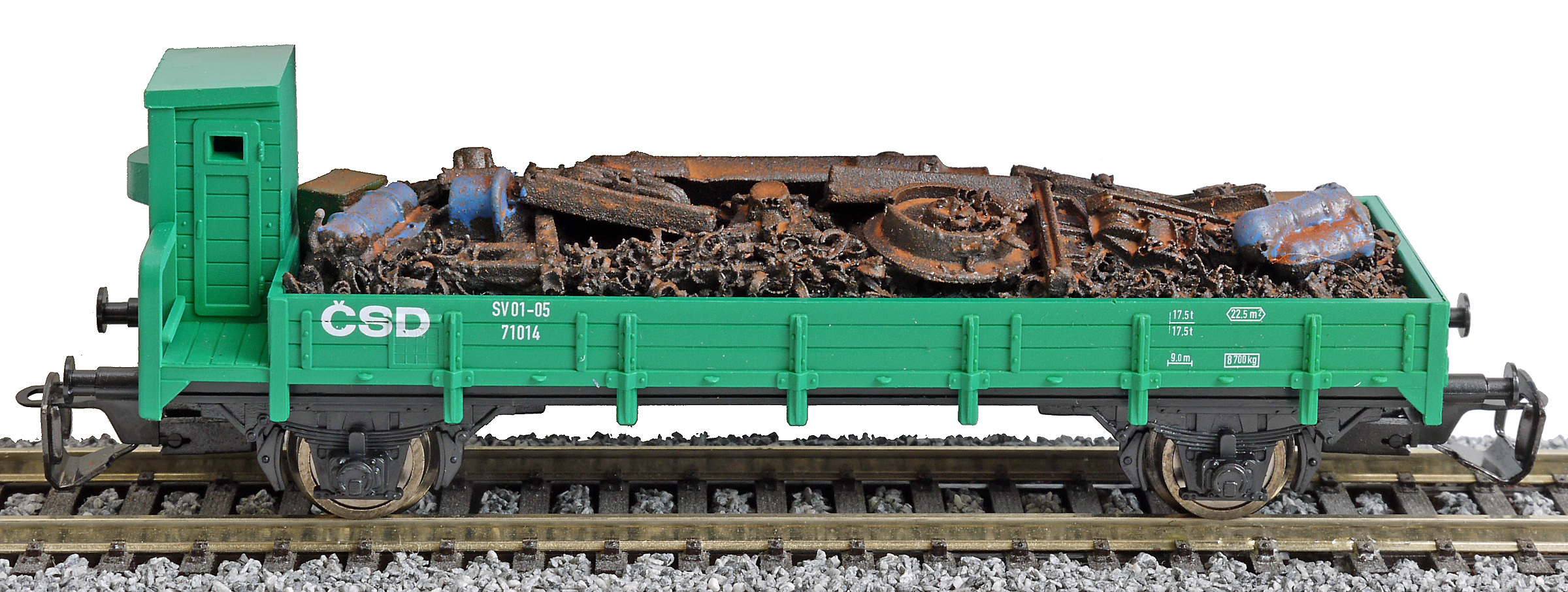 | nízkostěnný nákladní vůz zelený s brzdařskou budkou a nákladem šrotu do pracovního vlaku |