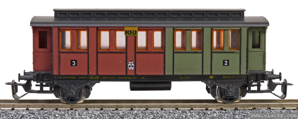 | osobní vůz červenohnědý-zelený s černou střechou 3./2. tř. |