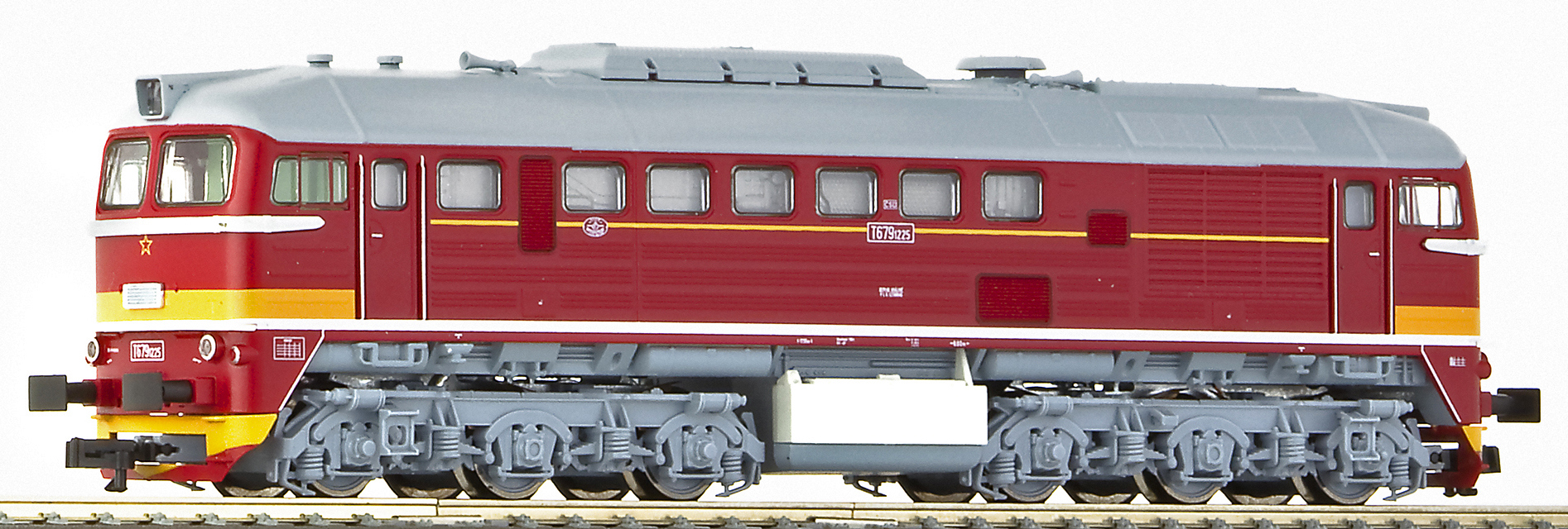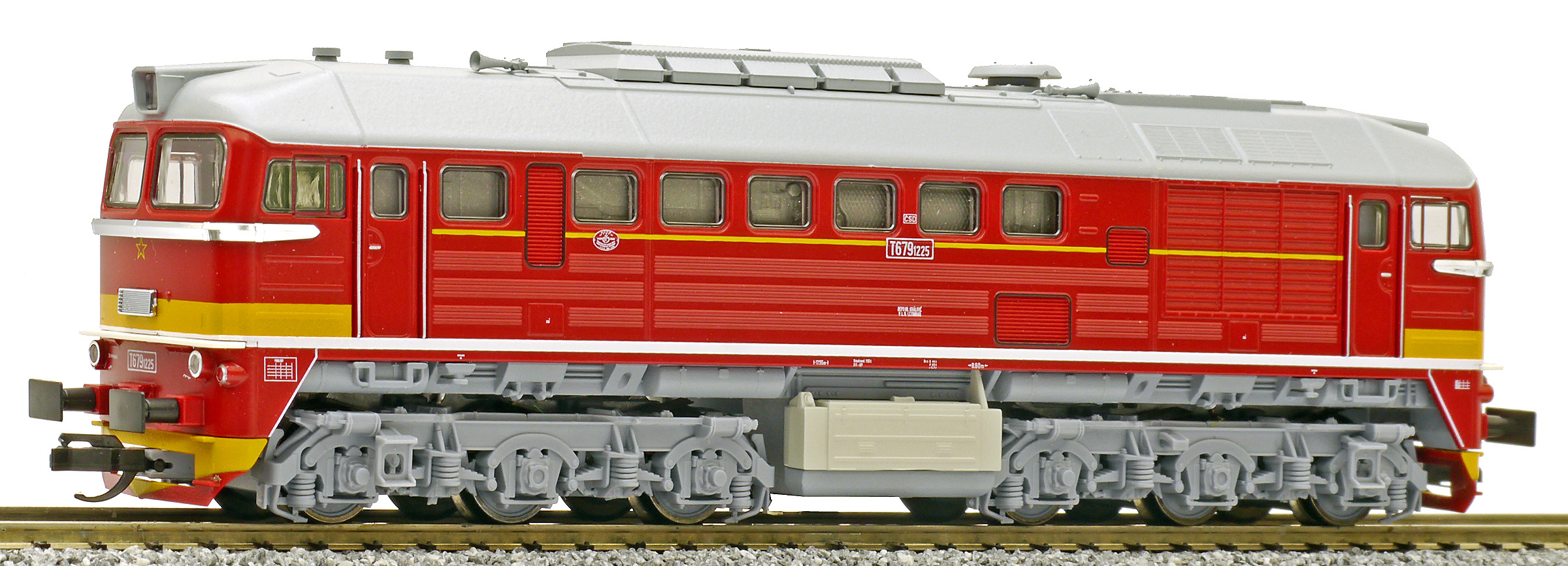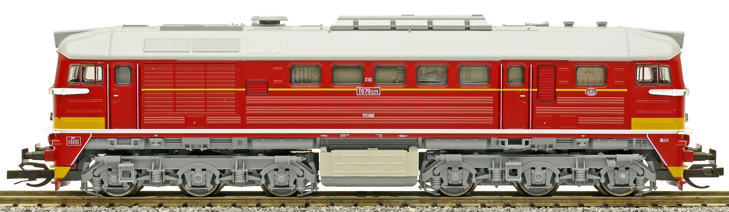 Popis   dieselová lokomotiva červená s šedou střechou a pojezdem, oranžový pás na čelech