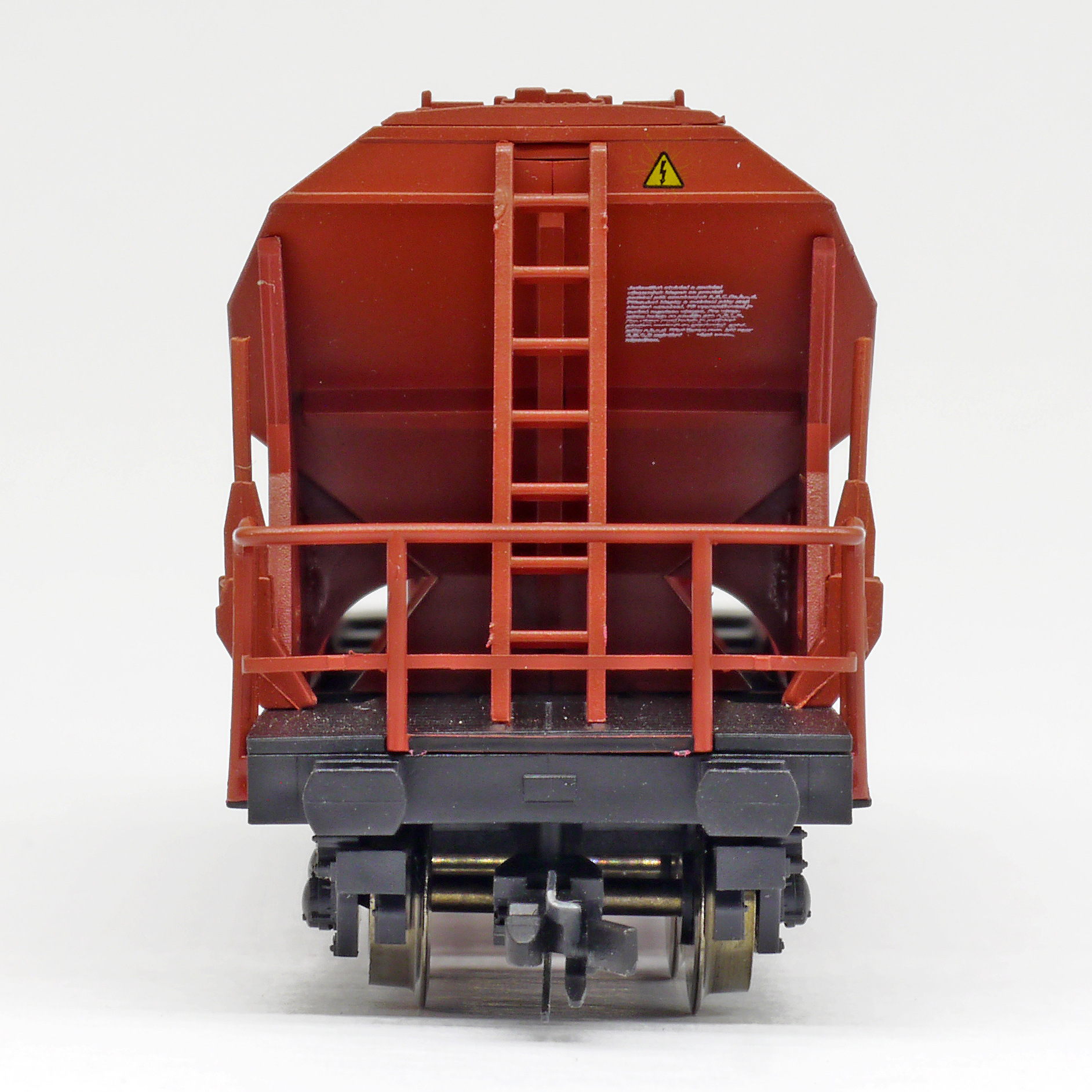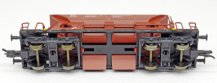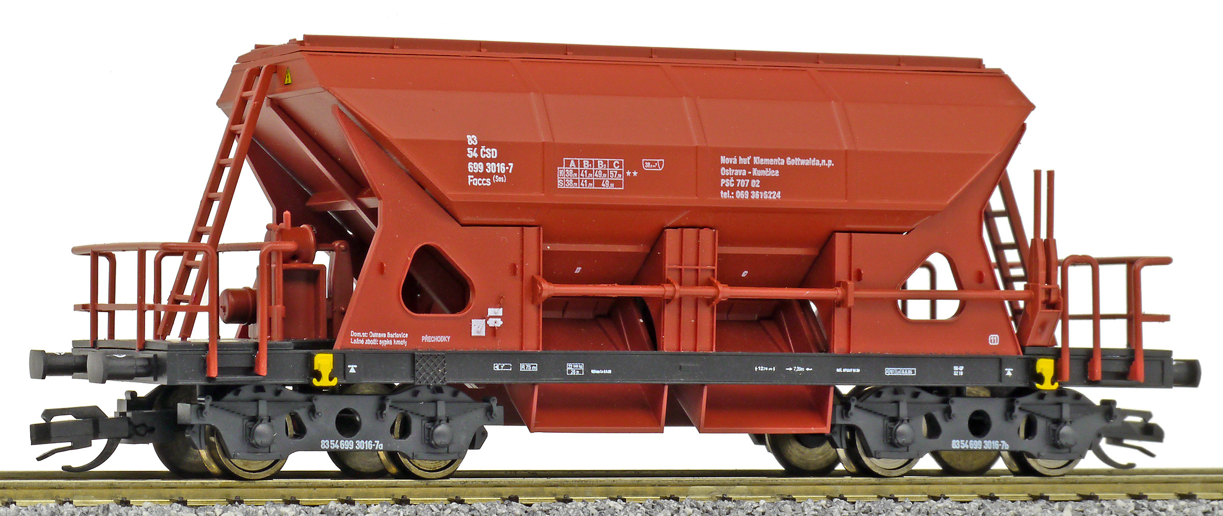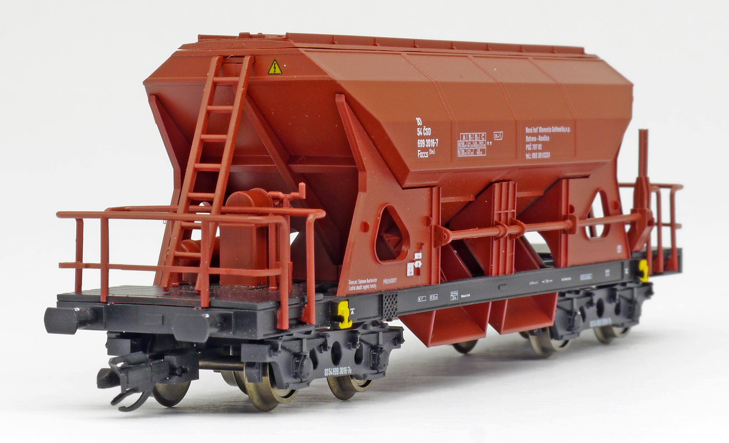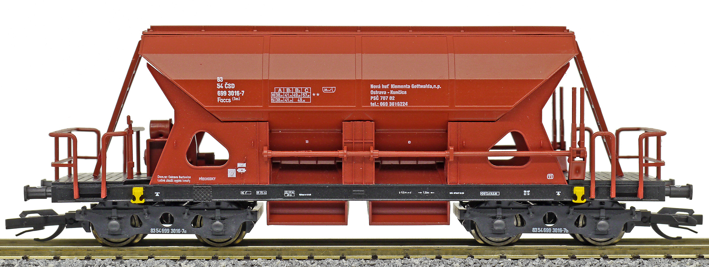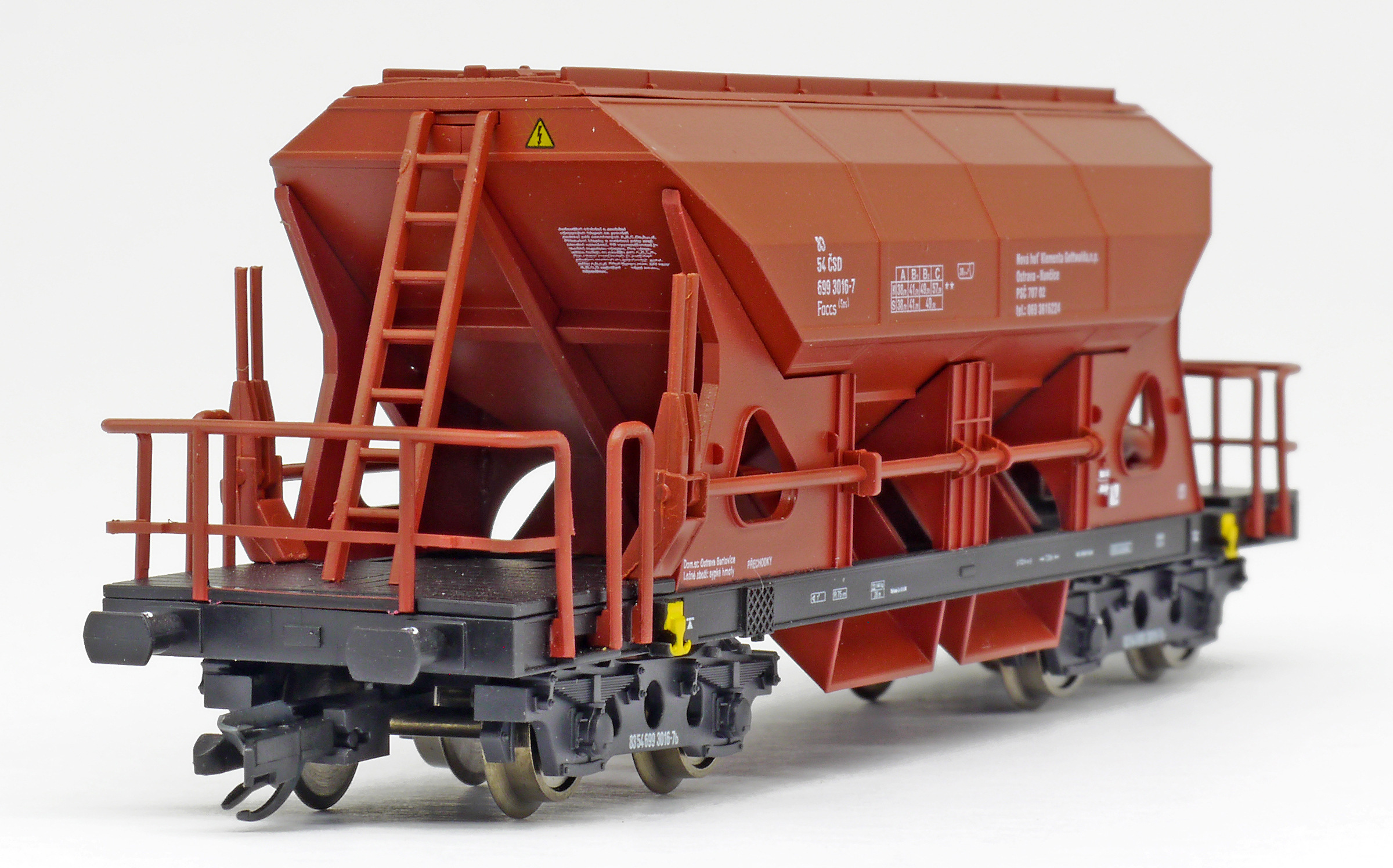| nákladní samovýsypný vůz červenohnědý s černým rámem, s klapkami „NHKG Ostrava-Kunčice“ |