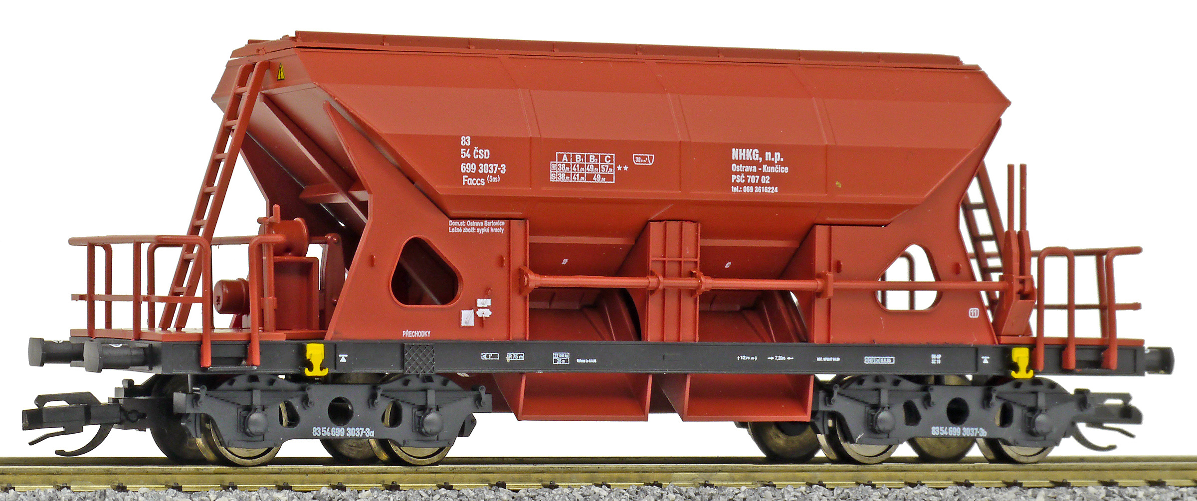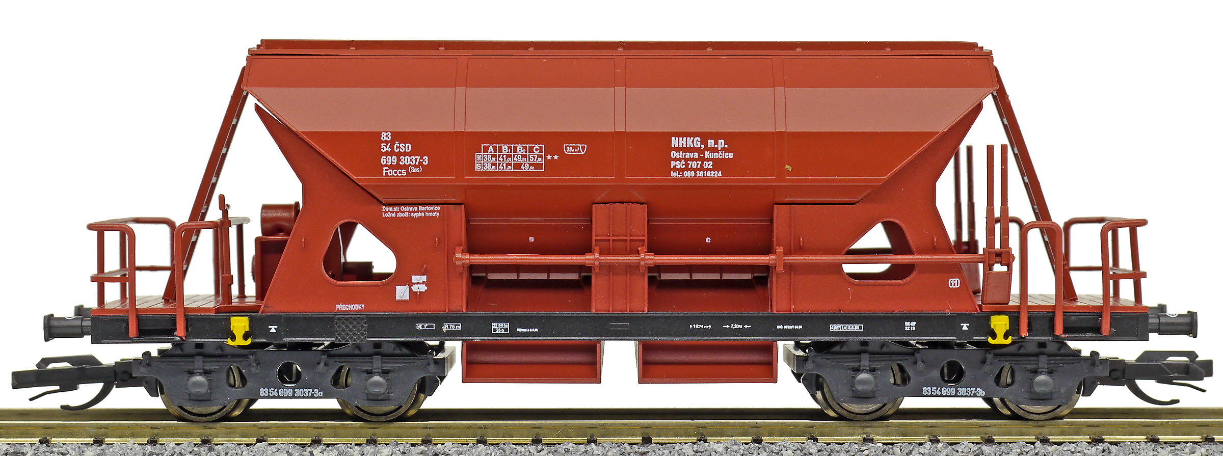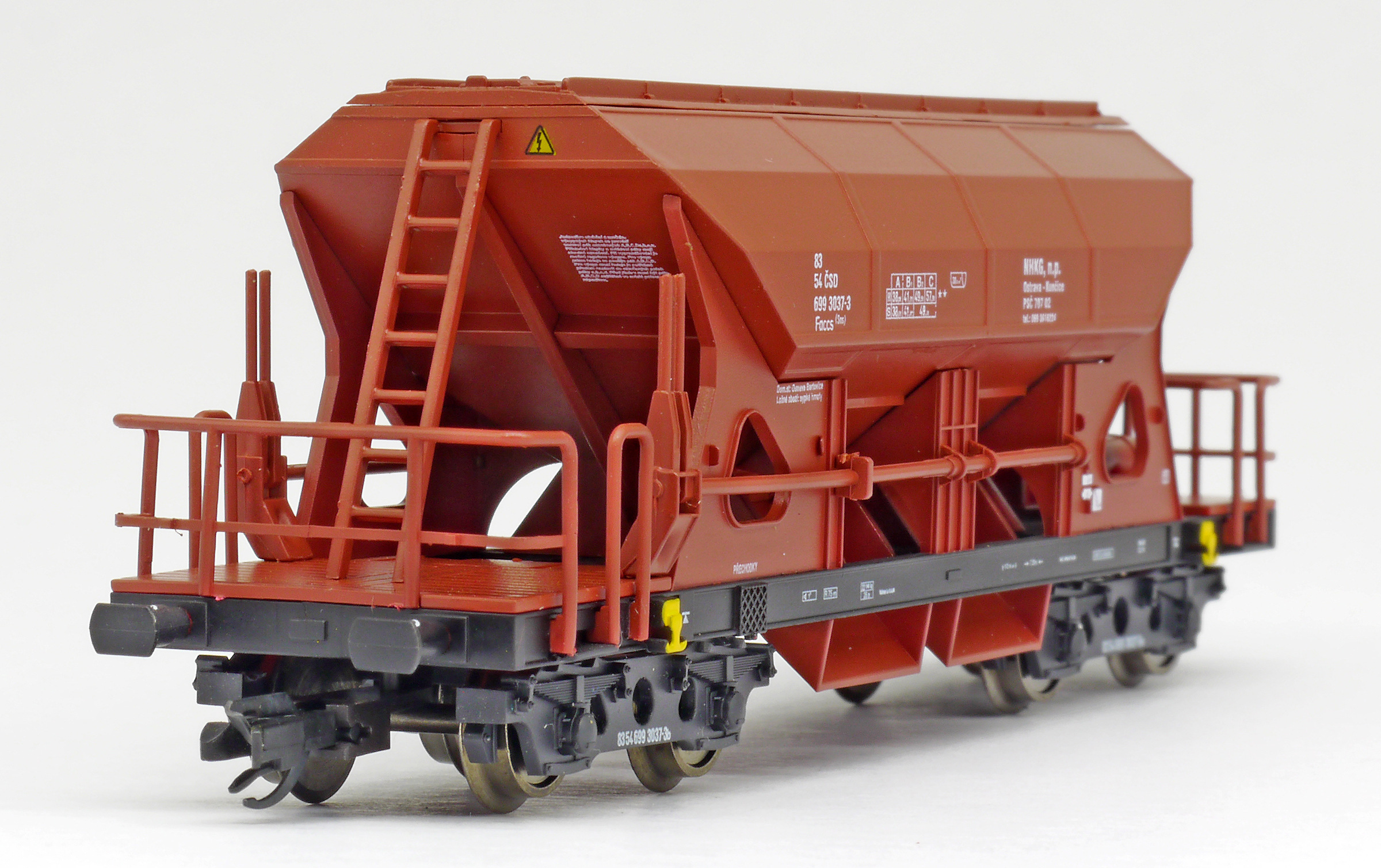 | nákladní samovýsypný vůz červenohnědý s černým rámem, s klapkami „NHKG Ostrava-Kunčice“ |
