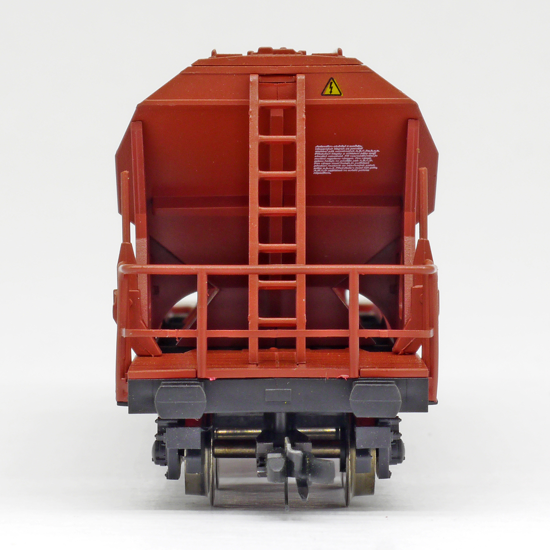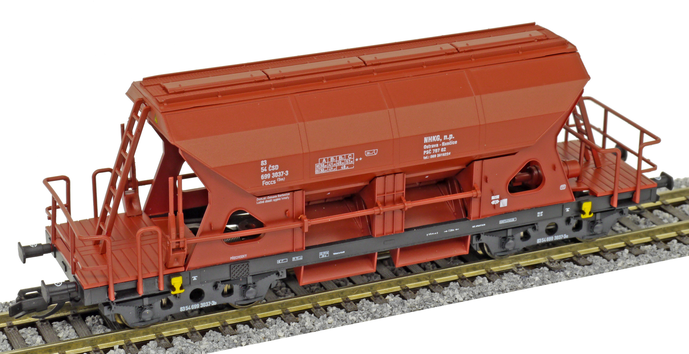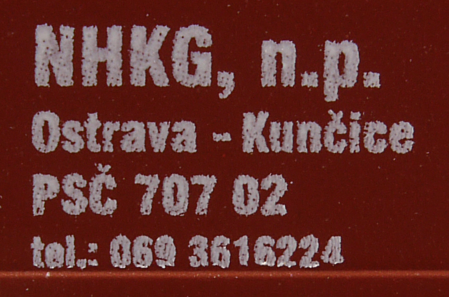 | nákladní samovýsypný vůz červenohnědý s černým rámem, s klapkami „NHKG Ostrava-Kunčice“ |