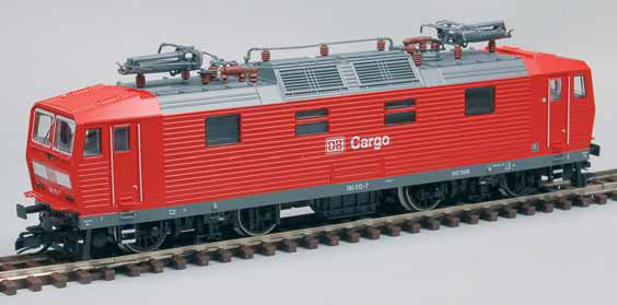 | elektrická lokomotiva červená s šedou střechou a rámem „DB Cargo“ |