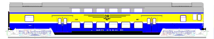 | řídící patrový vůz v barevné kombinaci modrá-žlutá „S-Bahn Halle-Leipzig“ |