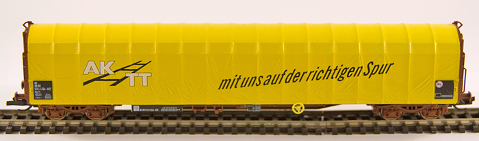 | nákladní vůz červenohnědý se žlutou plachtou „AKTT“ |