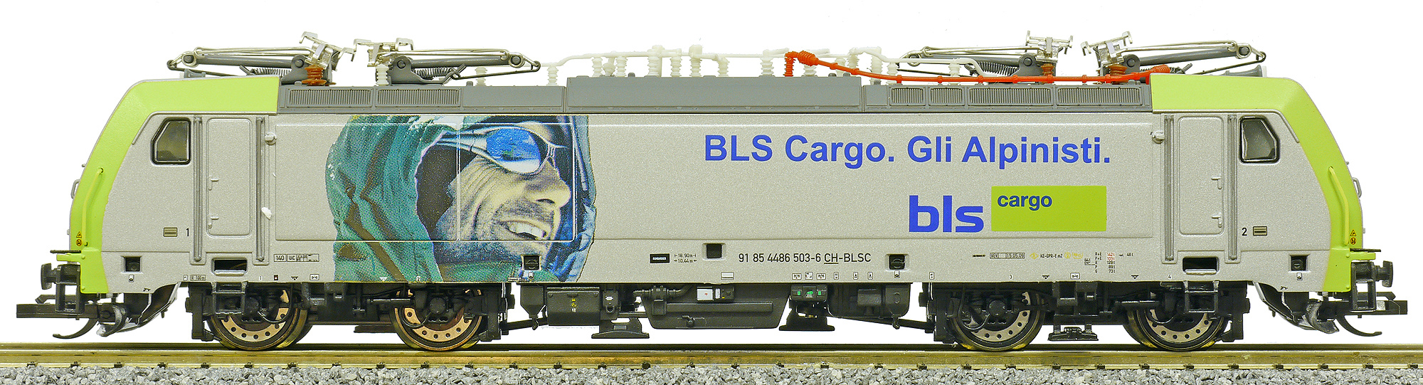 Popis   elektrická lokomotiva žlutá-stříbrná „Gli Alpinisti“