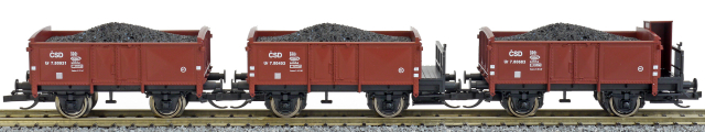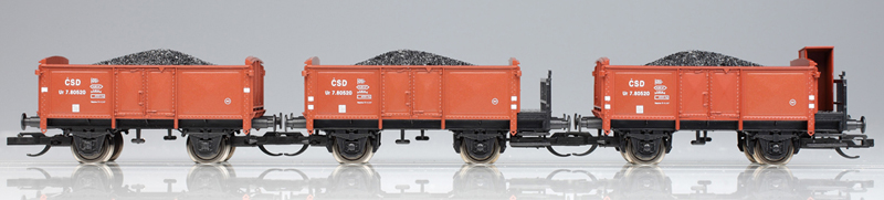 | otevřený nákladní vůz červenohnědý s brzdařskou plošinou ložený uhlím |