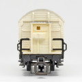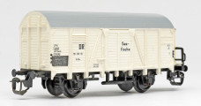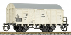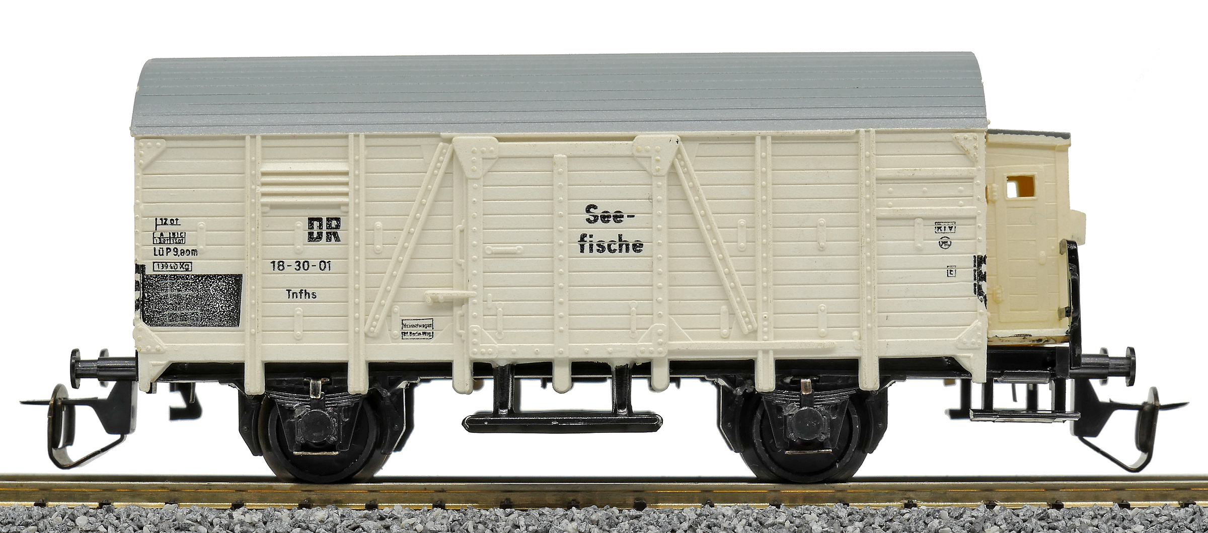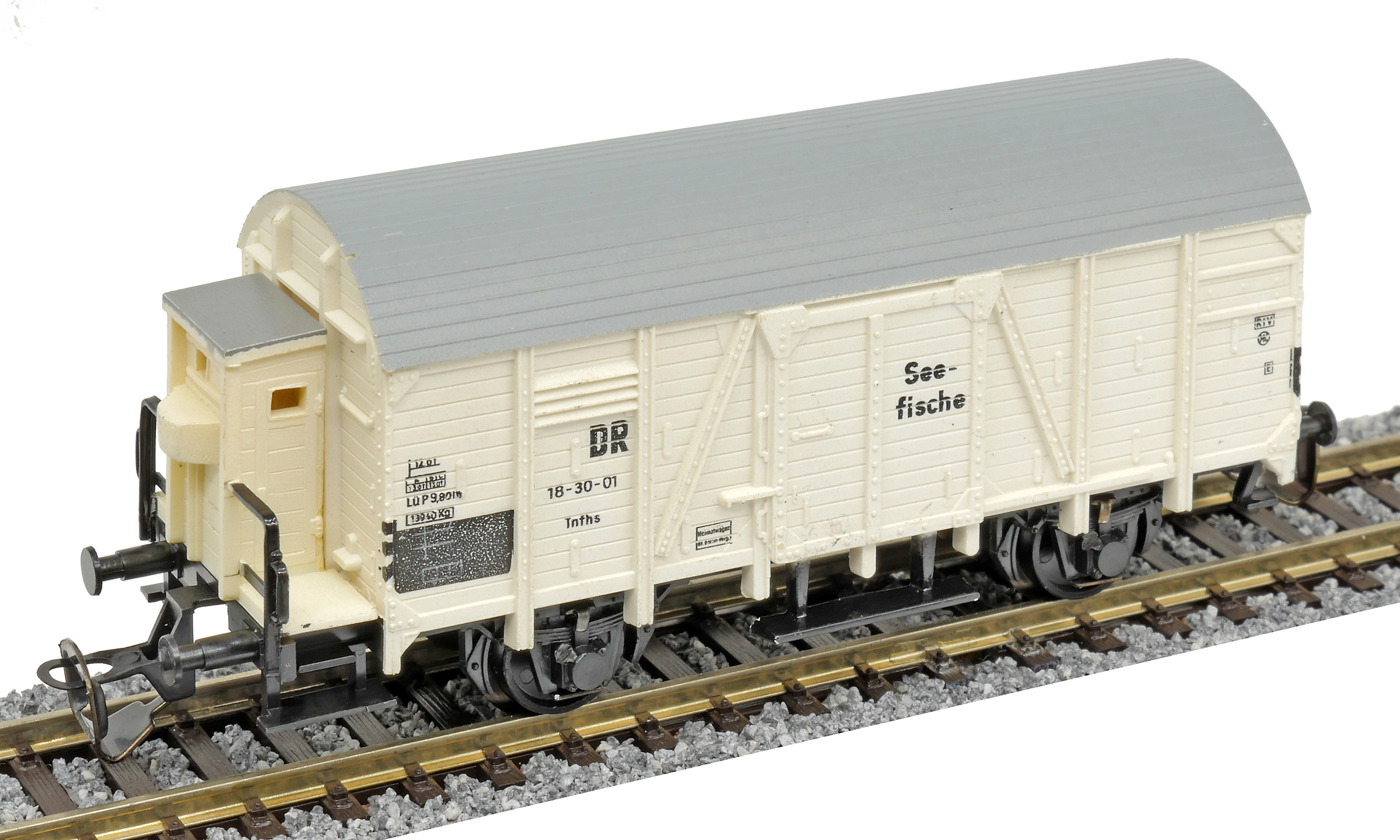 | nákladní chladící vůz bílý s šedou střechou a s brzdařskou budkou na přepravu ryb „Seefische“ |
