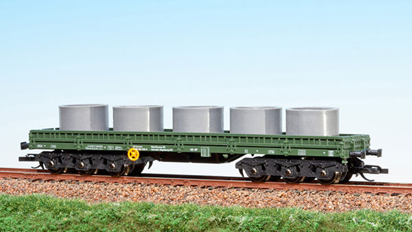 | zelený do stavebního vlaku s nákladem betonových skruží |