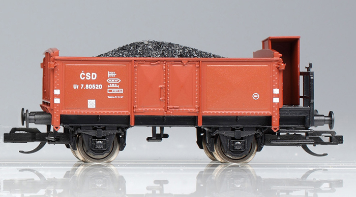 | otevřený nákladní vůz červenohnědý s brzdařskou budkou ložený uhlím |