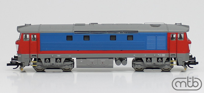 Popis   dieselová lokomotiva červená-modrá, šedá střecha a rám