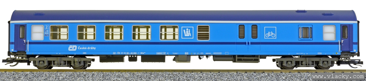 rychlíkový vůz modrý-bílý v barevném chematu „Najbrt“ 2. tř. se služebním oddílem