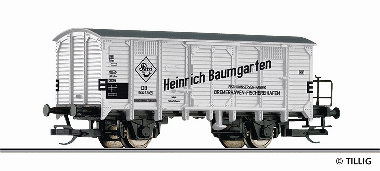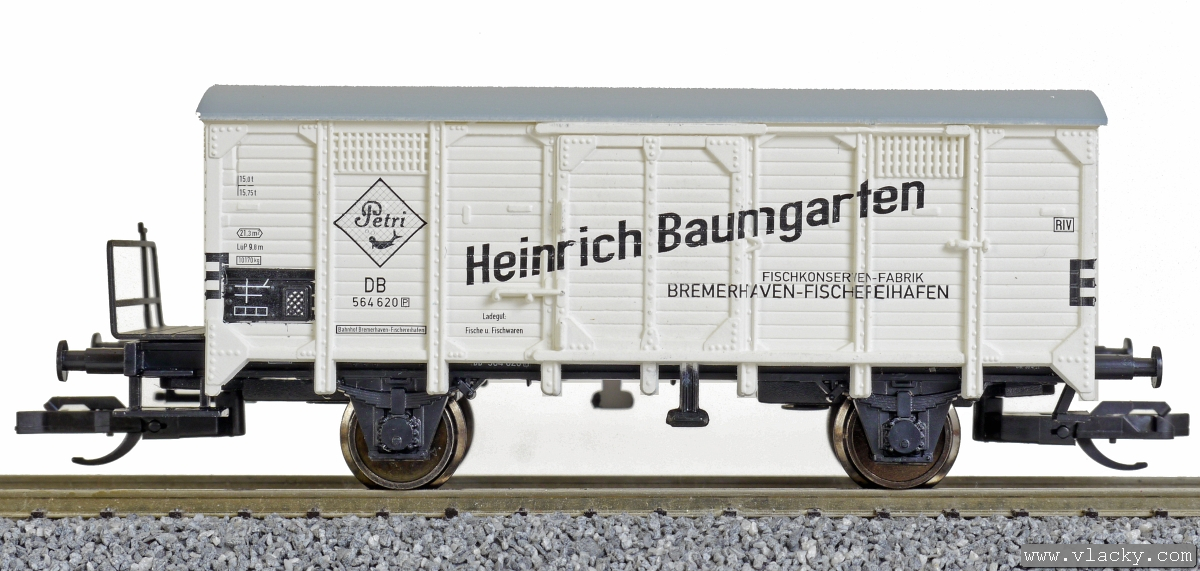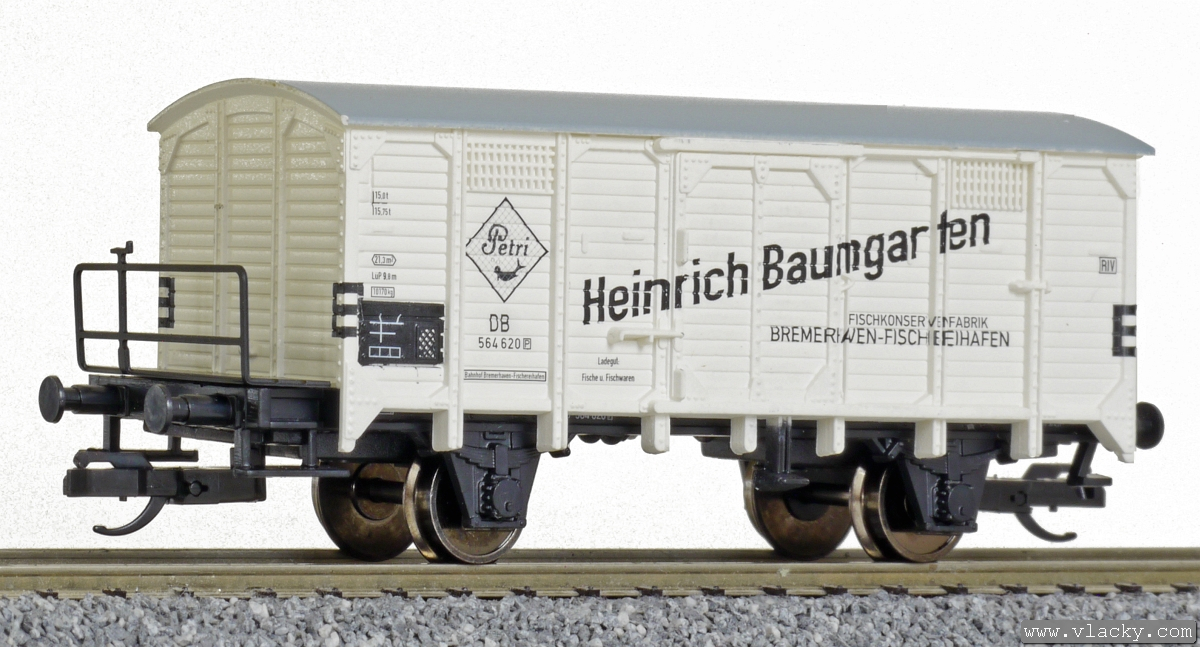 krytý nákladní vůz bílý s černou střechou a brzdařskou plošinou „Petri Fischkonserven“
