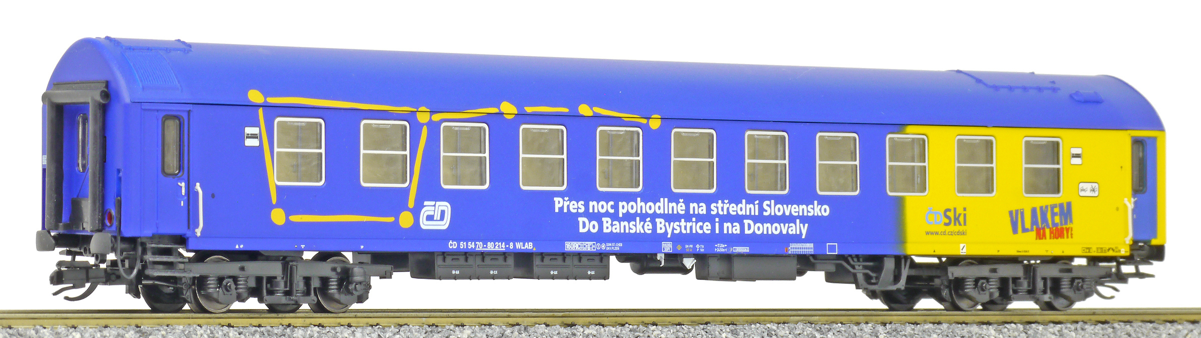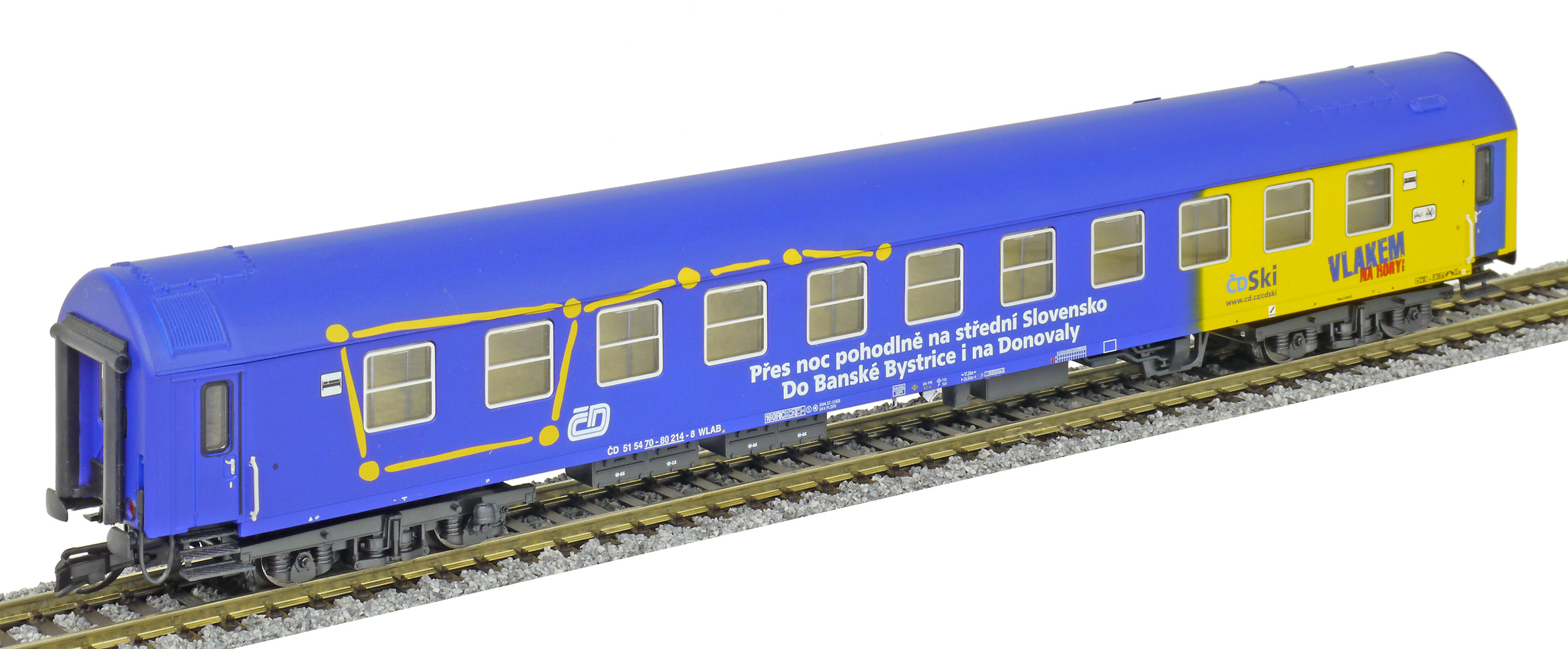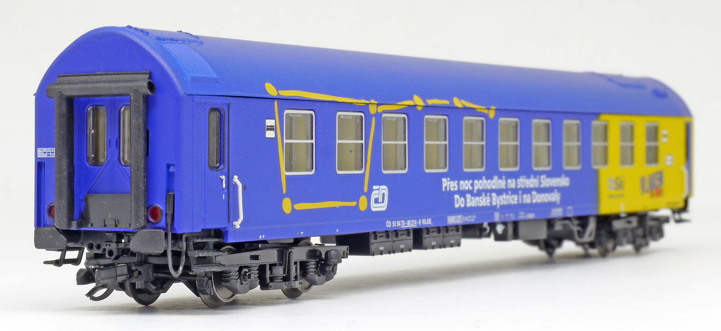 | lůžkový vůz modrý-žlutý s reklamním potiskem |