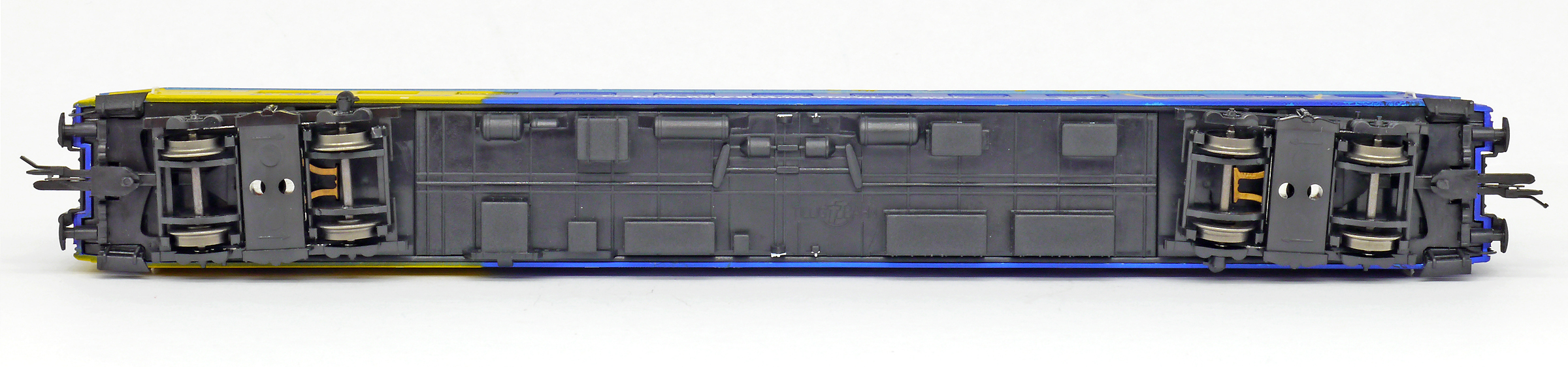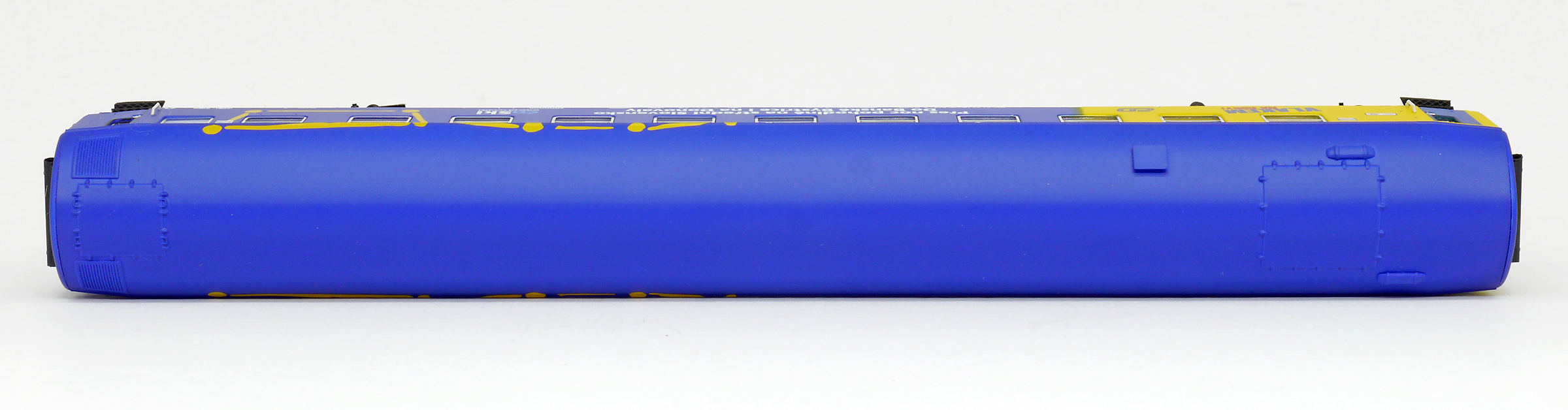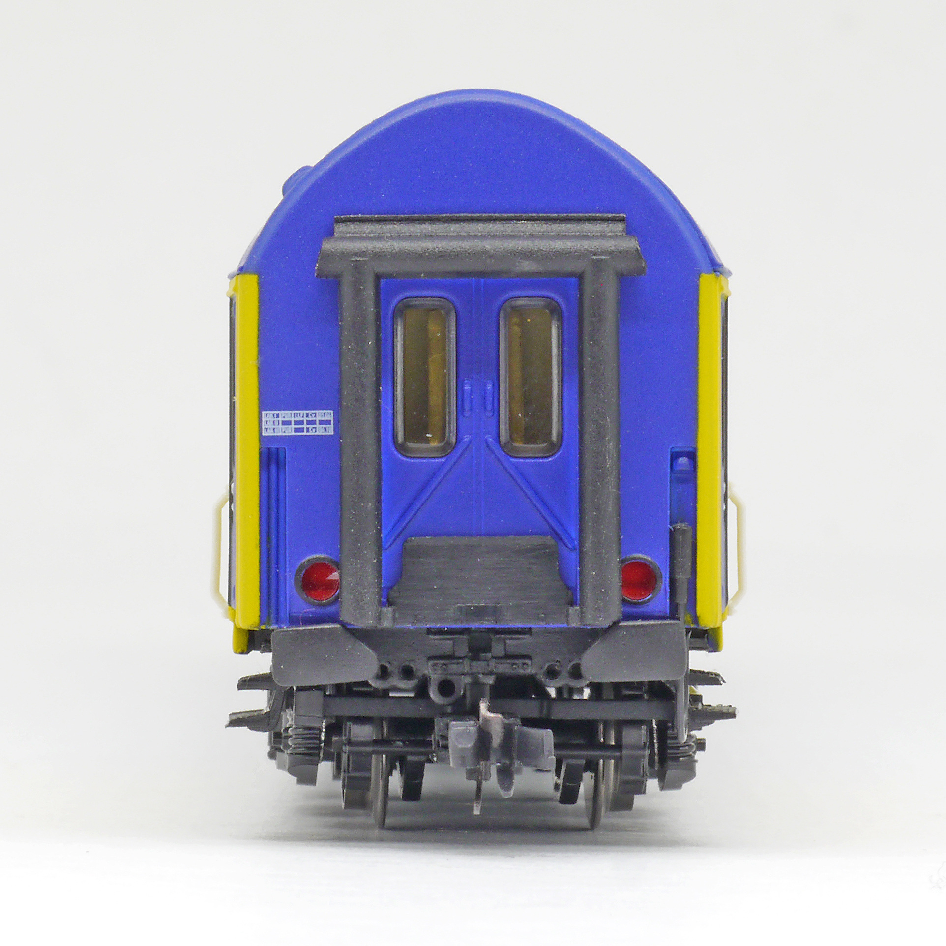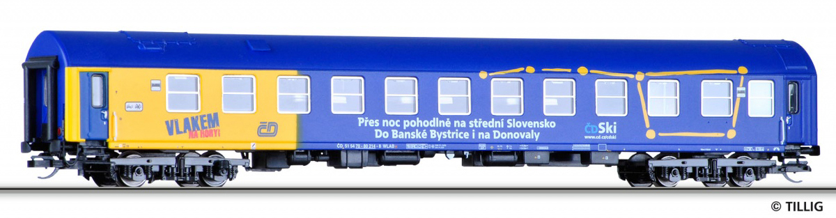 | lůžkový vůz modrý-žlutý s reklamním potiskem |
