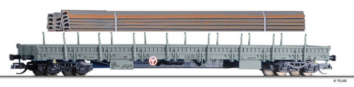 | nízkostěnný nákladní vůz šedý s nákladem ocelových nosníků |