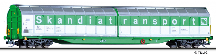 | krytý nákladní vůz hráškově zelený se stříbrnými bočnicemi „Skandiatransport“ |