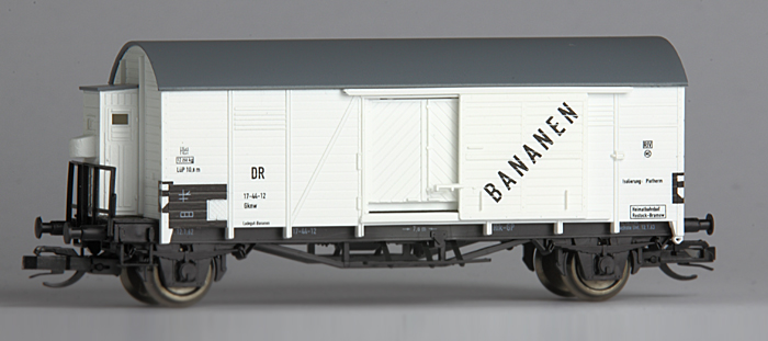 | bílý s šedou střechou a brzdařskou budkou „BANANEN“ |