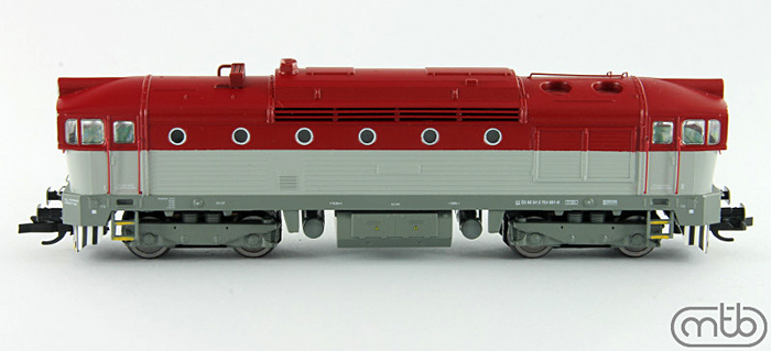 Popis   dieselová lokomotiva červená-bílá se světlešedým pojezdem