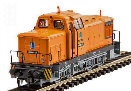 | oranžová s černým rámem a šedým pojezdem, školní lokomotiva |