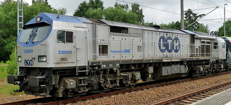| dieselová lokomotiva stříbrná-modrá s logem „LTH“ |
