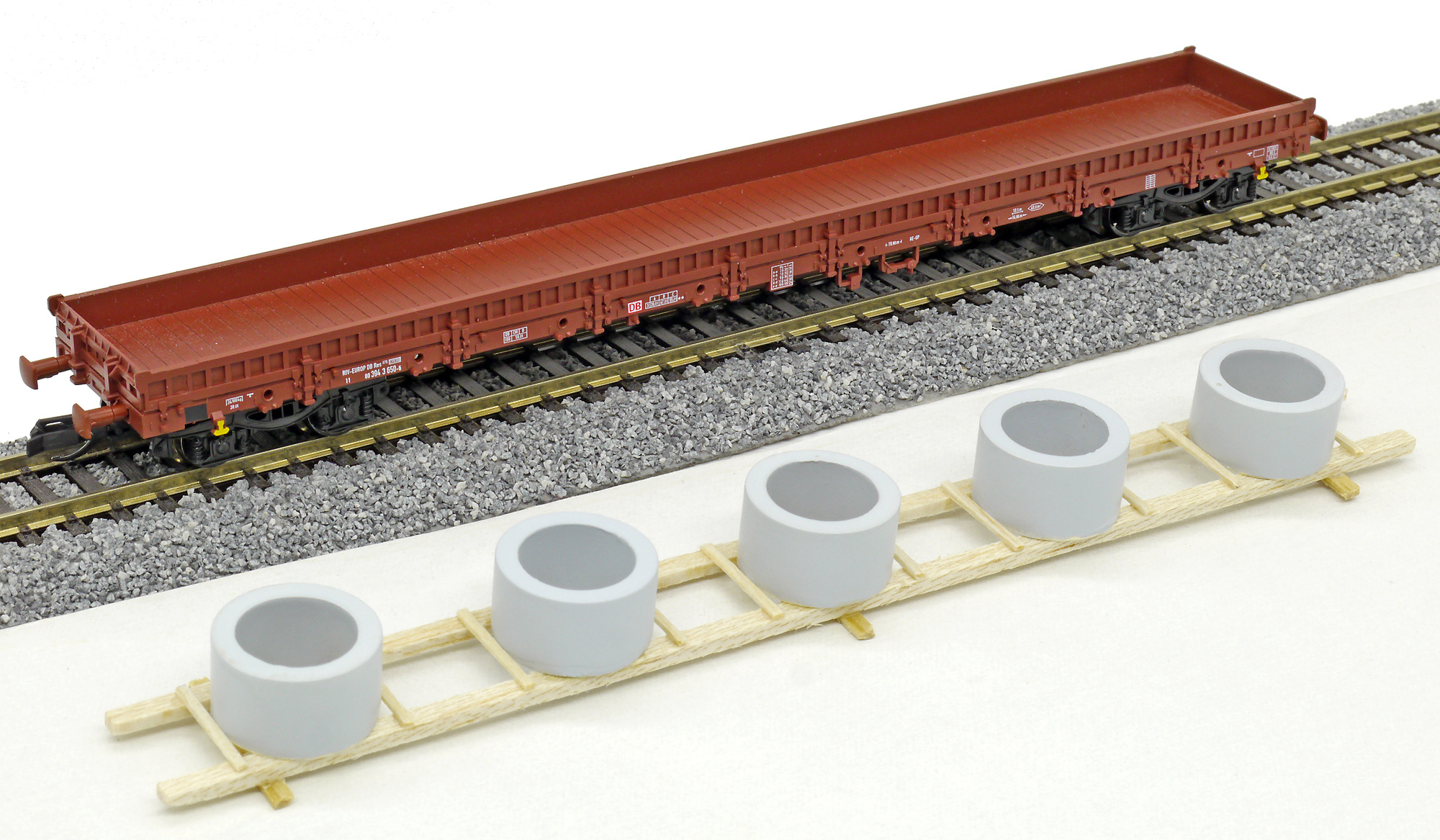 | nízkostěnný nákladní vůz hnědý s nákladem betonových skruží |