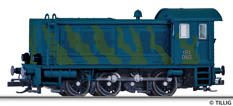 | dieselová lokomotiva v tmavém maskovacím nátěru |