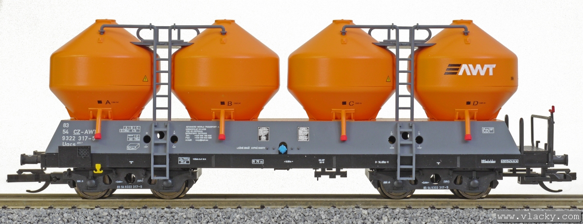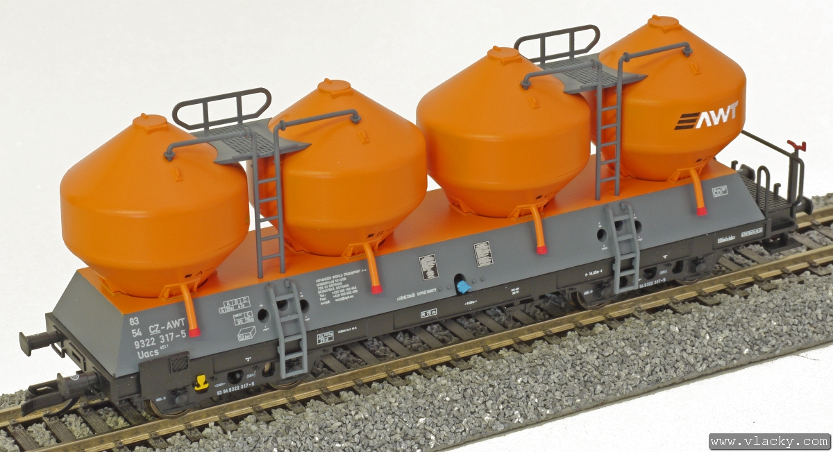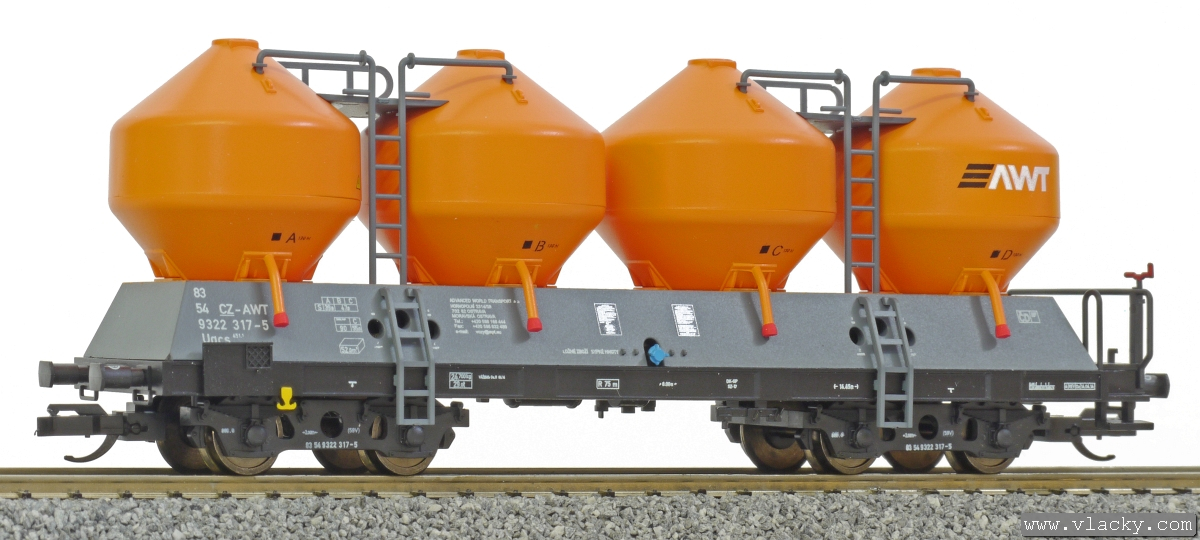 | nákladní samovýsypný vůz šedý-oranžový s oranžovými nádobami a s logem „AWT“ |