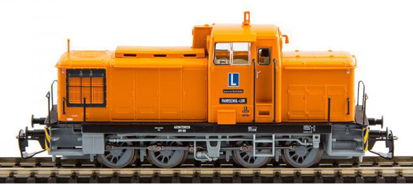 | oranžová s černým rámem a šedým pojezdem, školní lokomotiva |