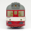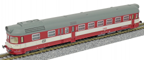 | motorový vůz červený s krémovým pruhem, šedá střecha |