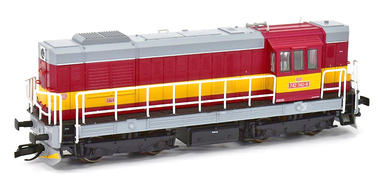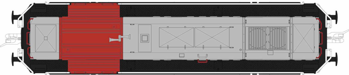 | dieselová lokomotiva červená se žlutým pásem, šedá střecha a rám, černé podvozky |