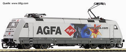 Popis   elektrická lokomotiva bílá s šedým rámem a reklamním potiskem „AGFA“