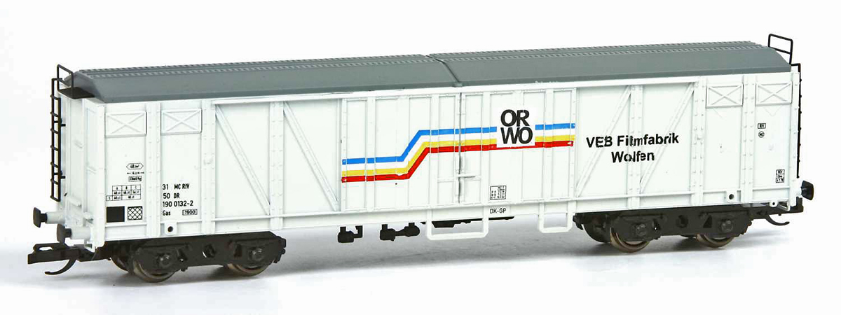 | krytý nákladní vůz šedý s reklamou „ORWO“ |