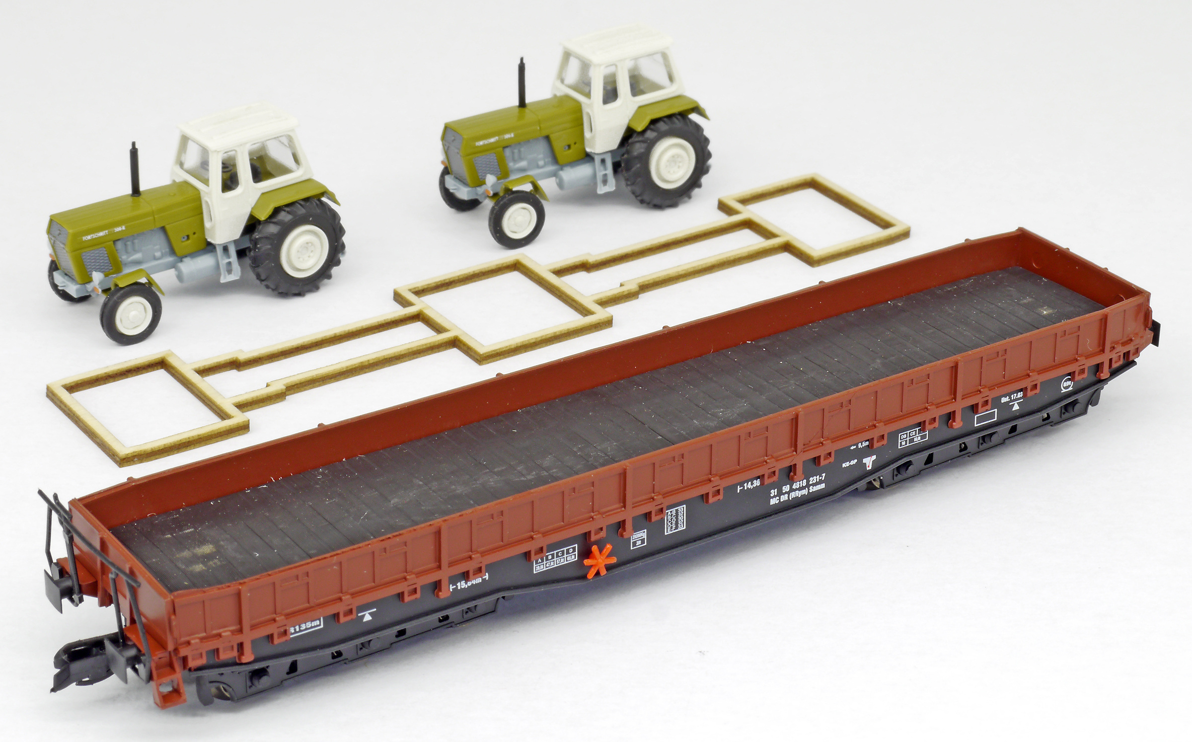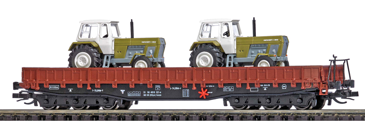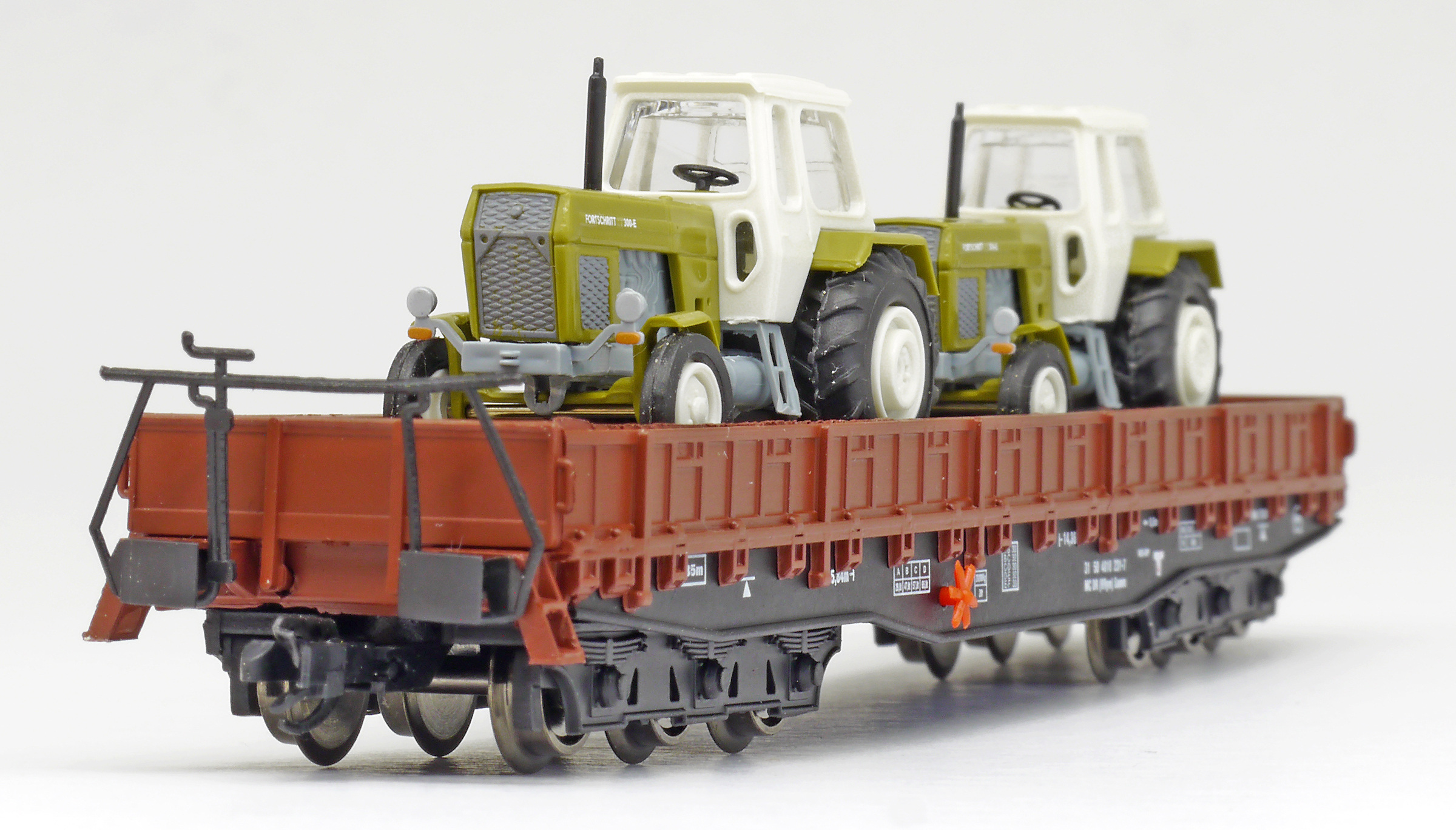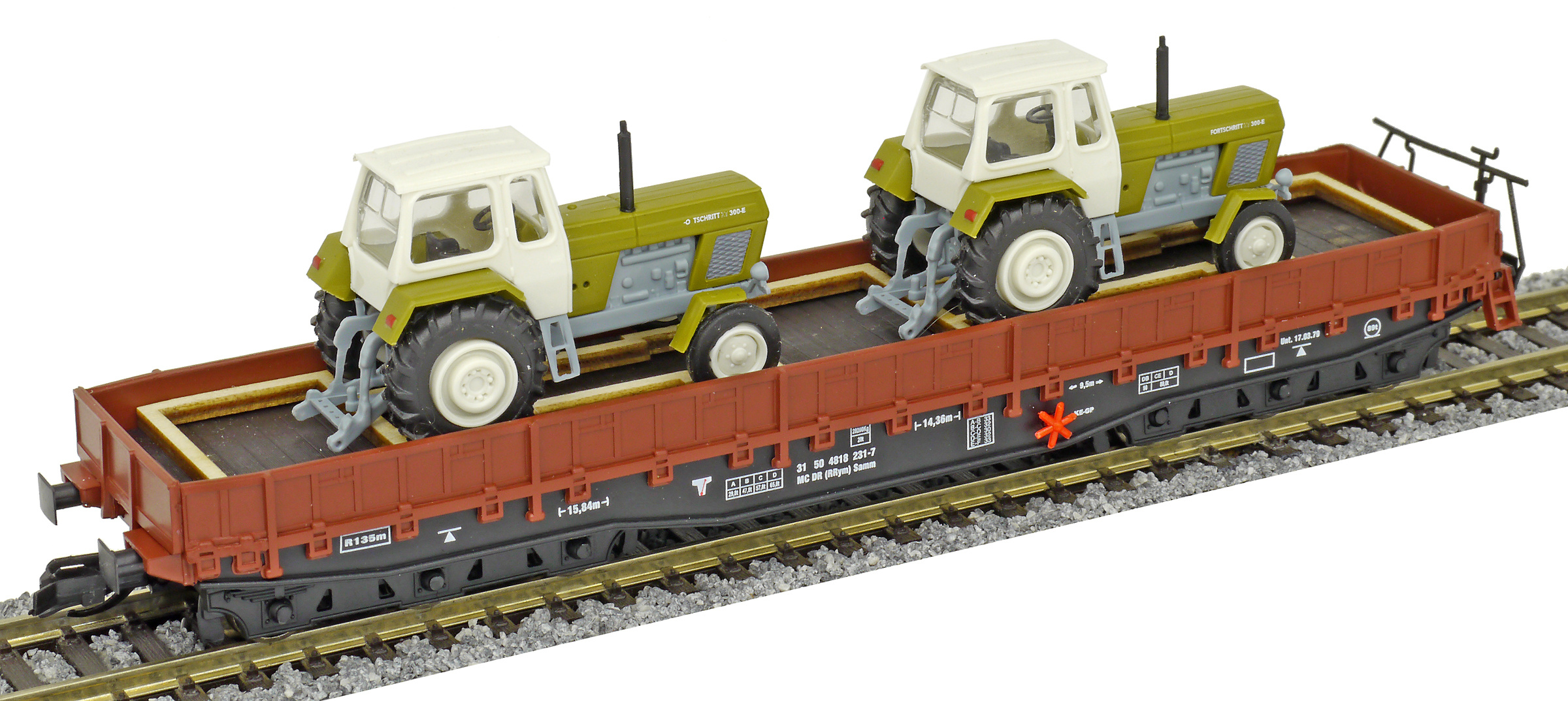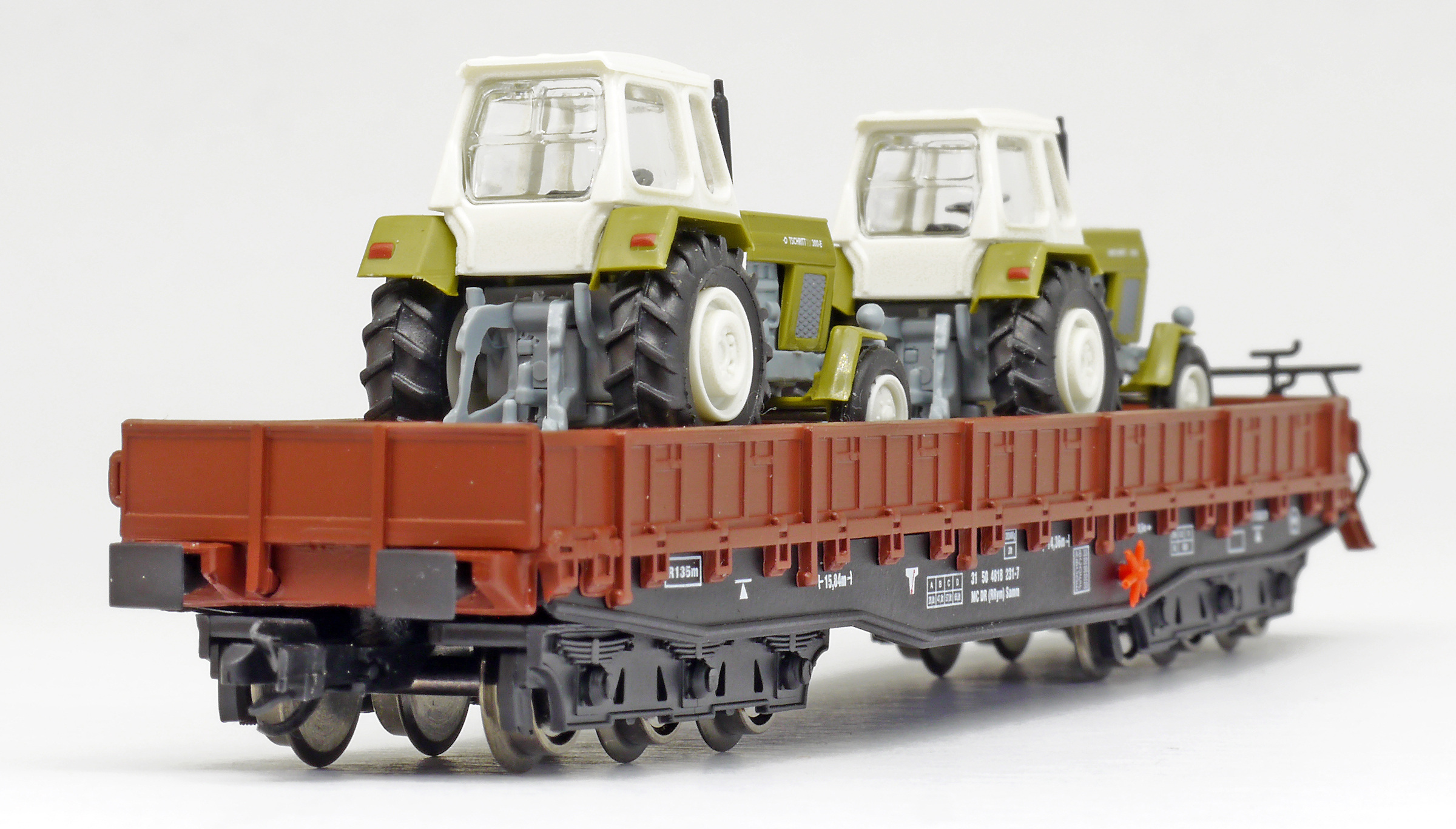 | nízkostěnný vůz červenohnědý s nákladem dvou traktorů ZT300 |