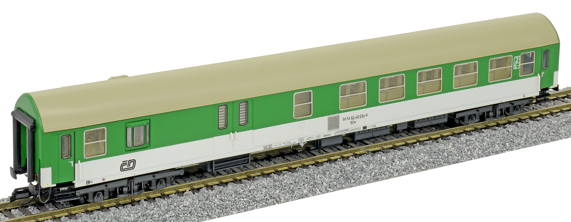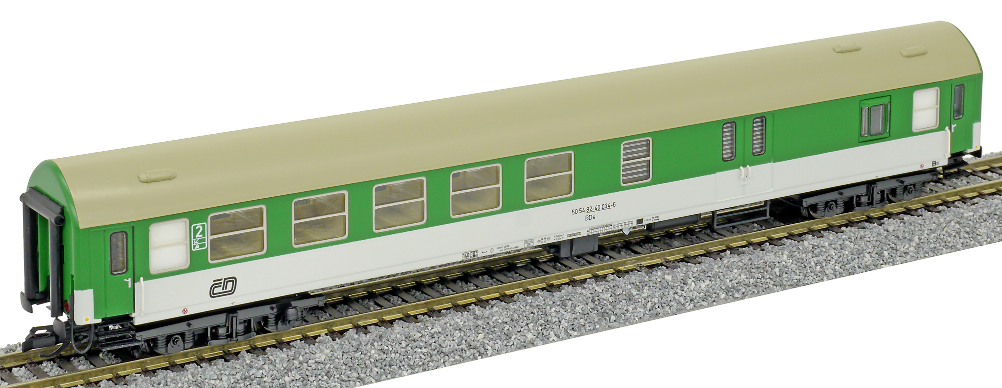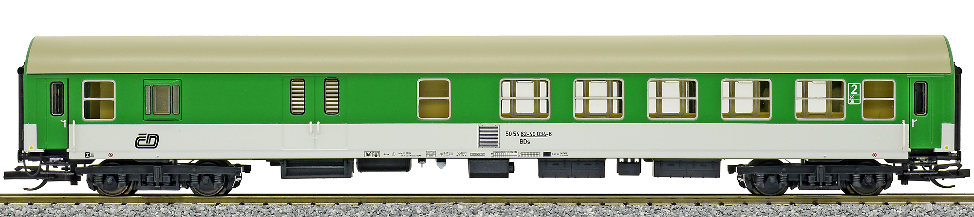 | rychlíkový vůz zelený-bílý s šedou střechou 2. tř. a zavazadlovým oddílem |