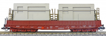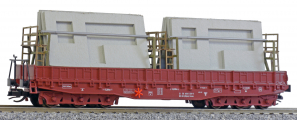 | nízkostěnný vůz červenohnědý s nákladem betonových prefabrikátů |